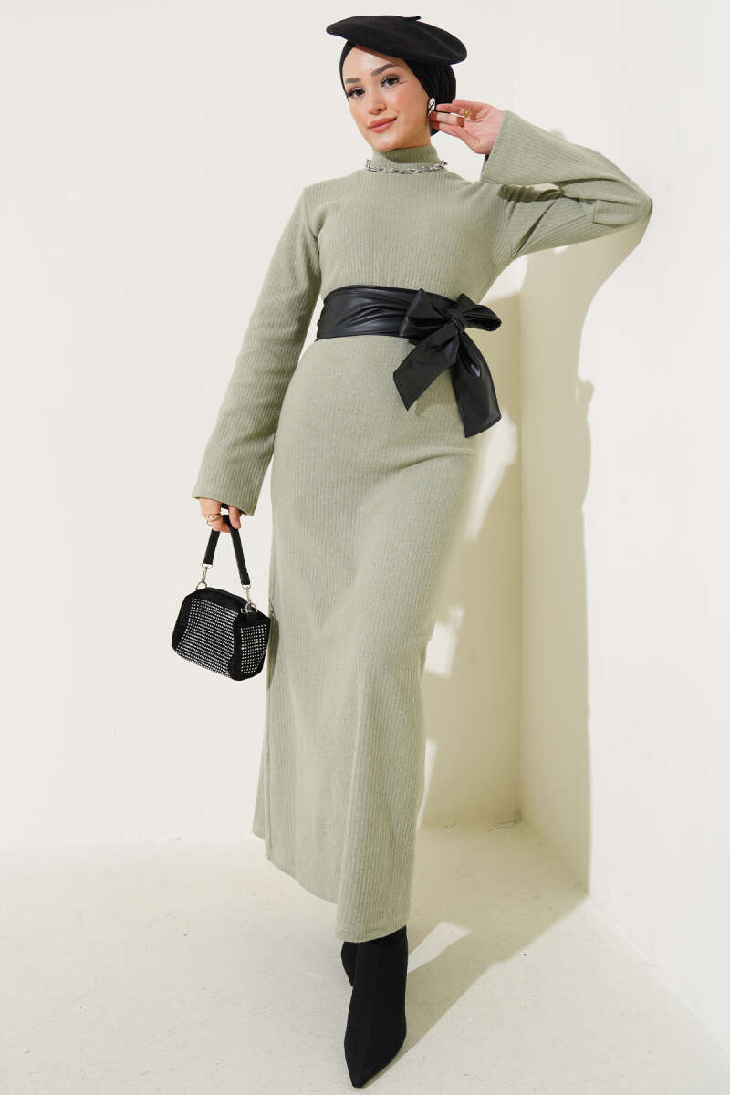 Scuba Pens Detaylı Kemerli Elbise Haki