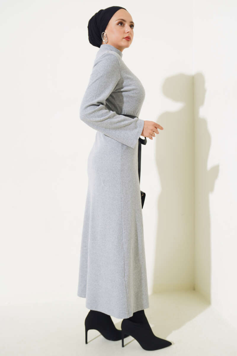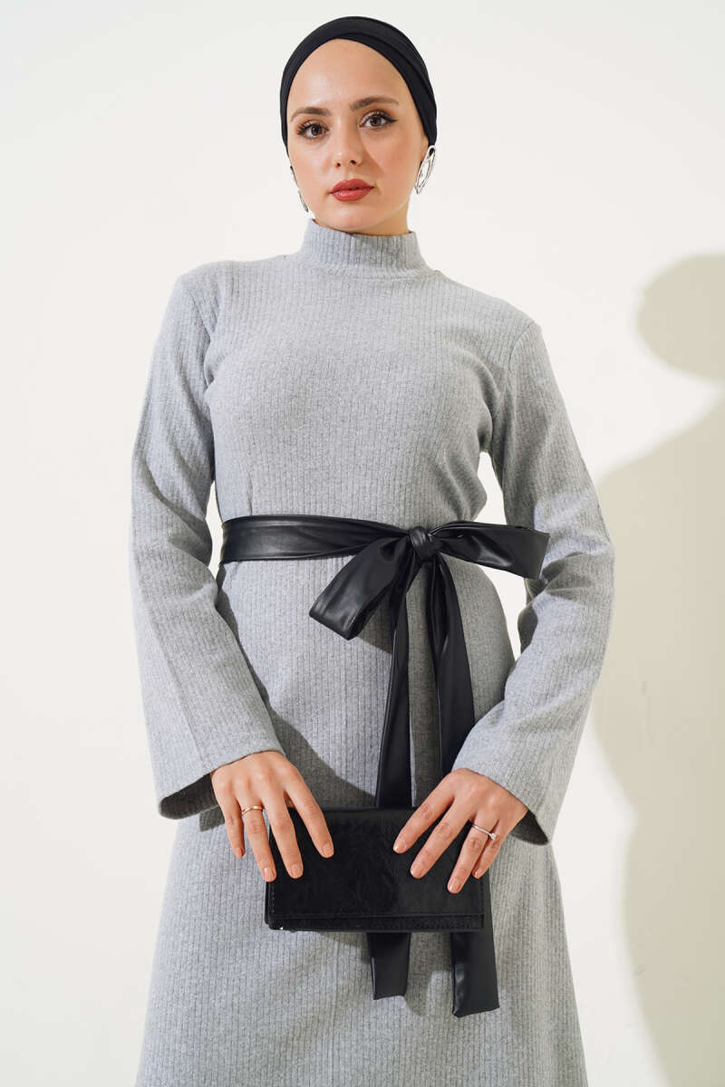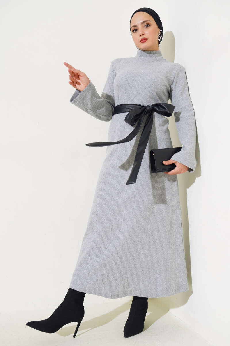 Deri Kuşaklı Fitilli Elbise Gri