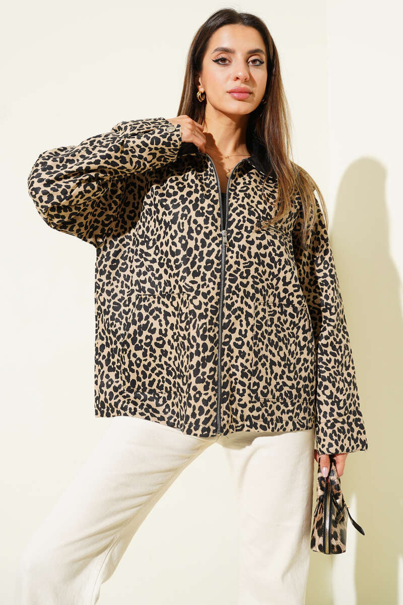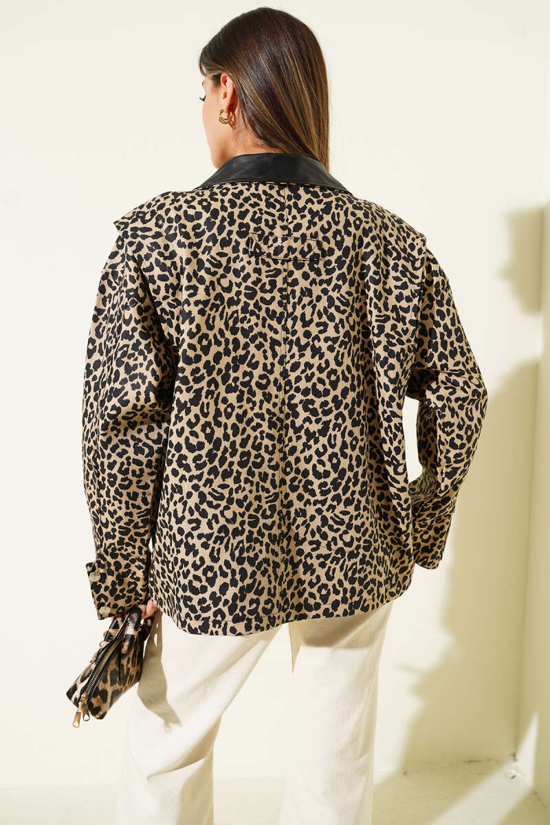 Deri Yakalı Leoparlı Gabardin Ceket Bej