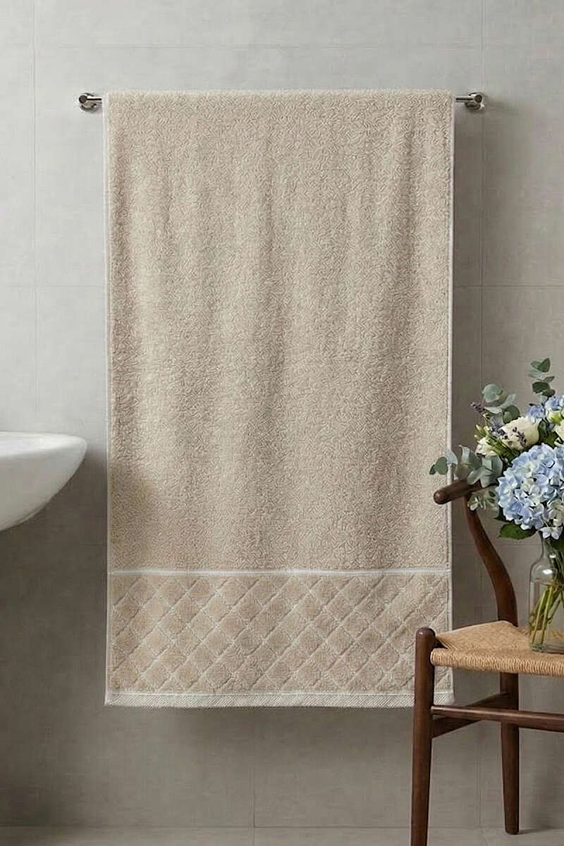 Desen Detaylı Şerit Geçişli Banyo Havlusu Bej