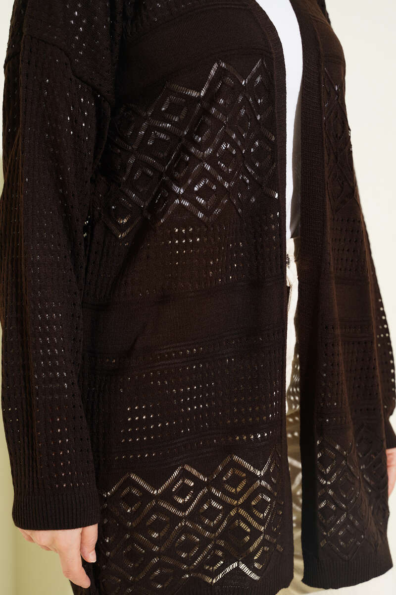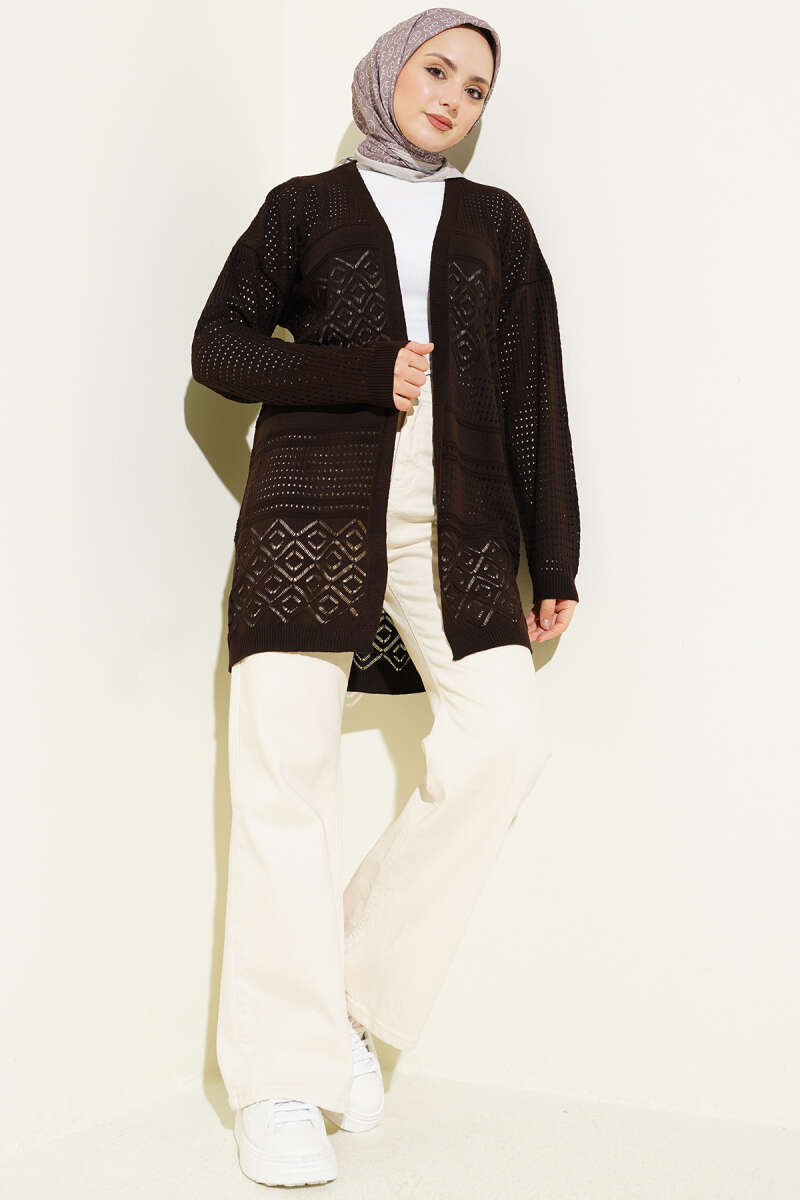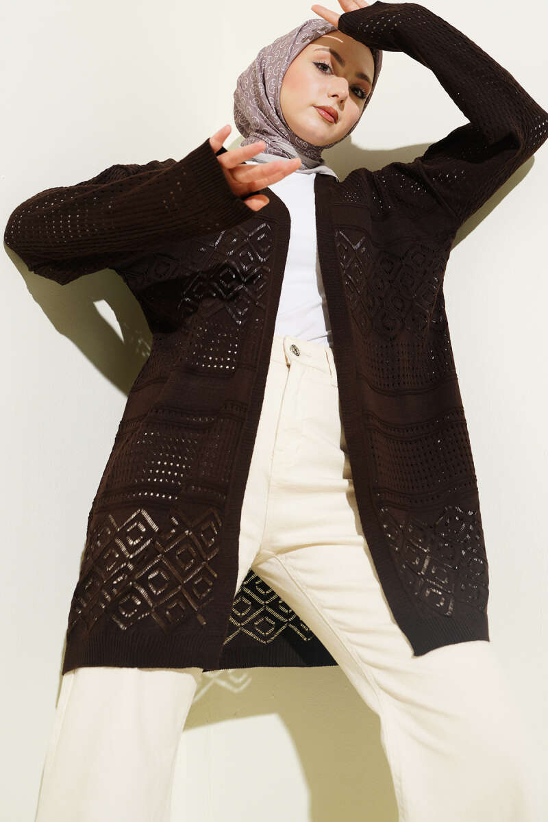 Desenli Ajurlu Triko Hırka Kahve