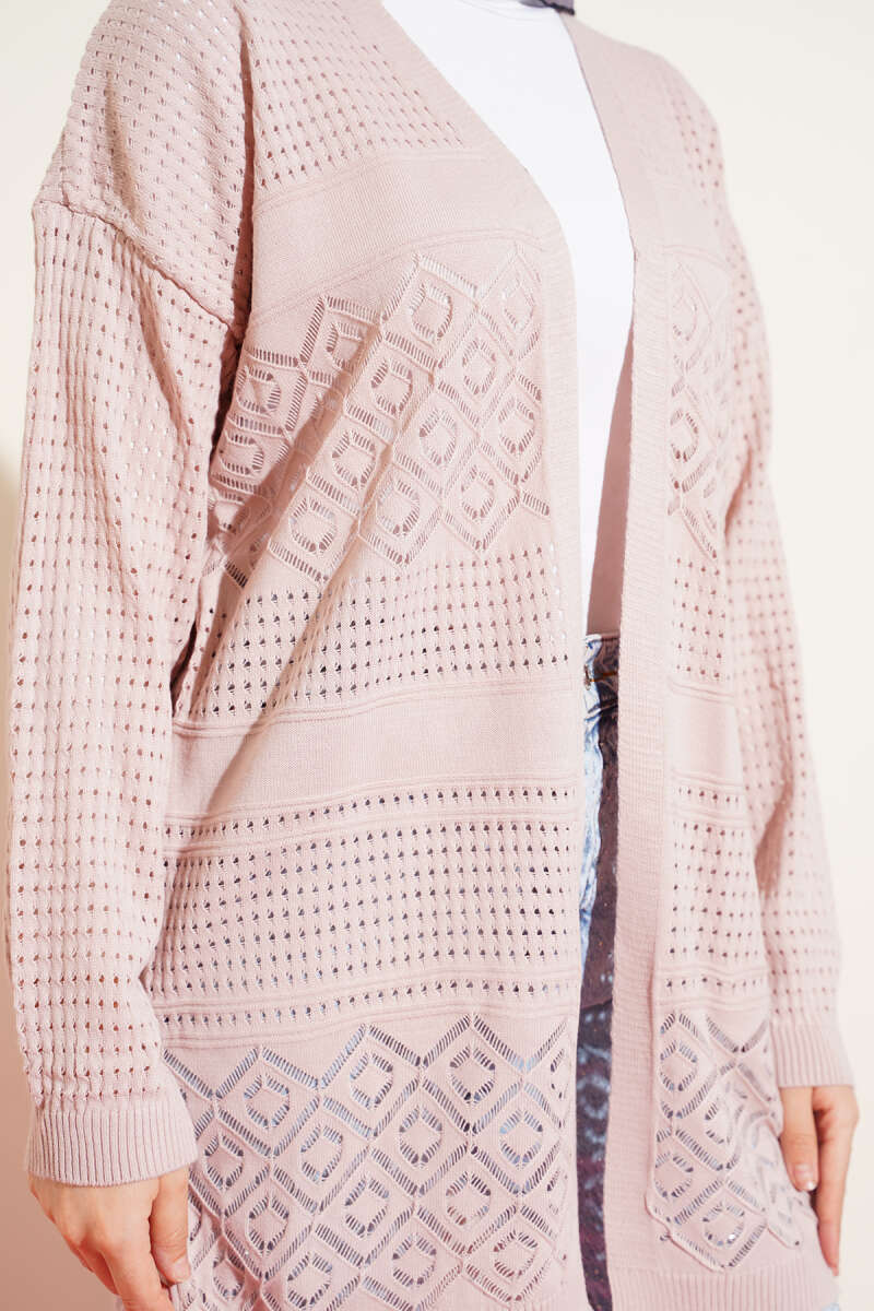 Desenli Ajurlu Basic Triko Hırka Pudra