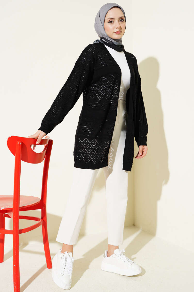 Desenli Ajurlu Basic Triko Hırka Siyah