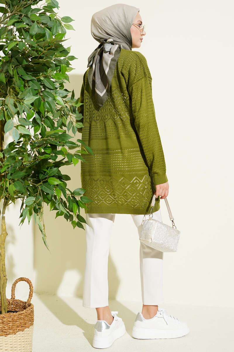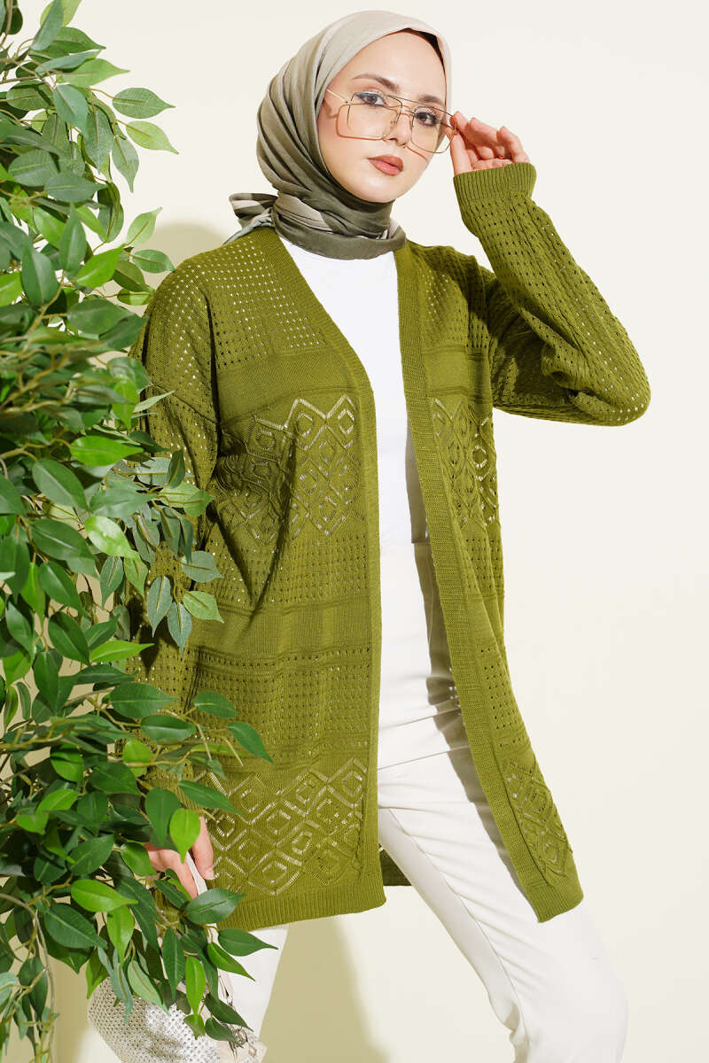 Desenli Ajurlu Basic Triko Hırka Yeşil