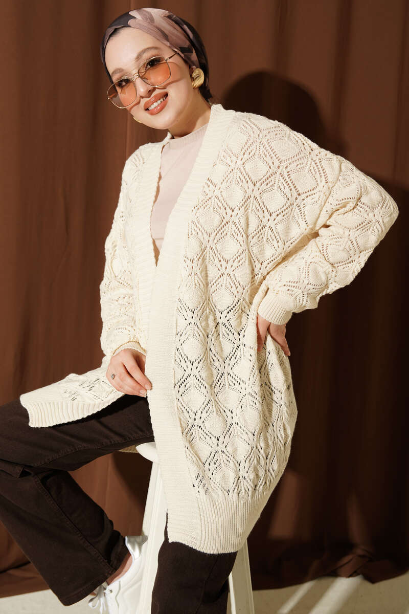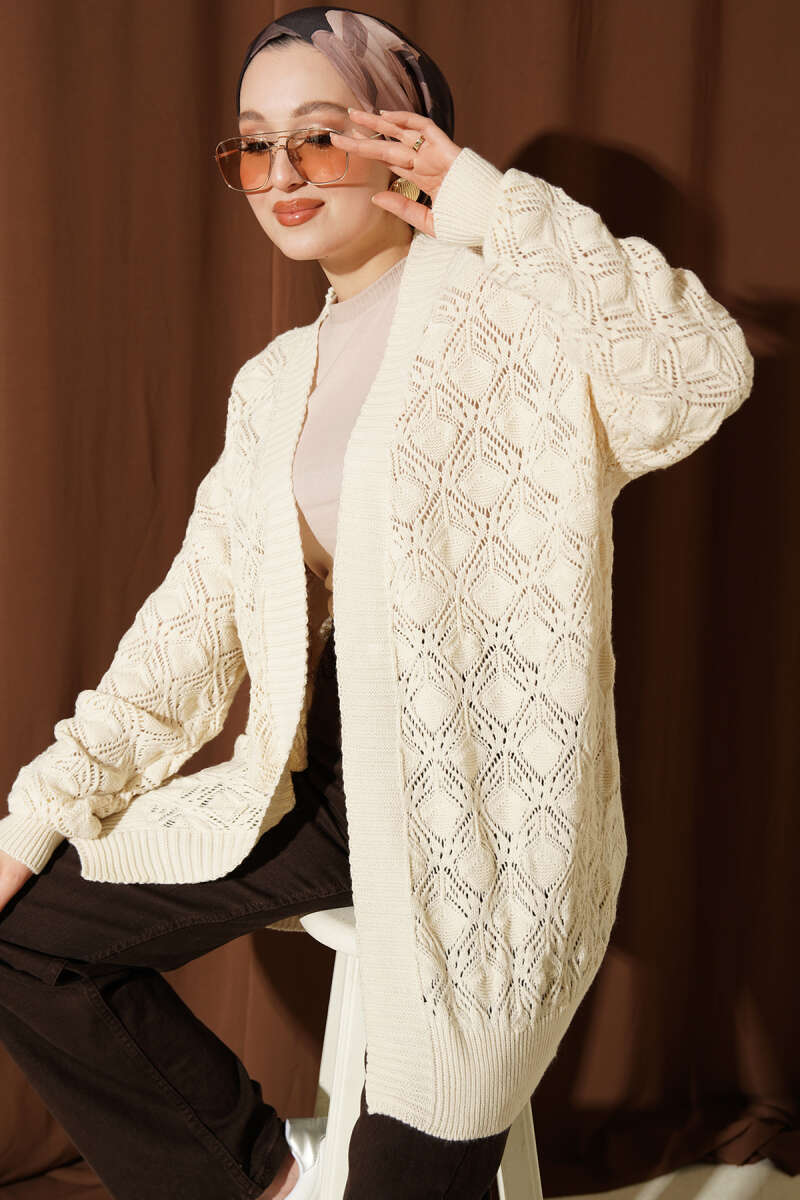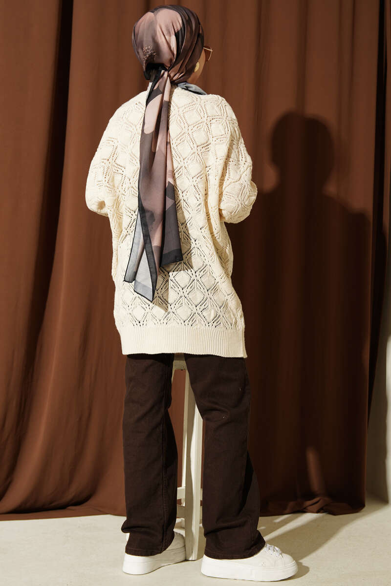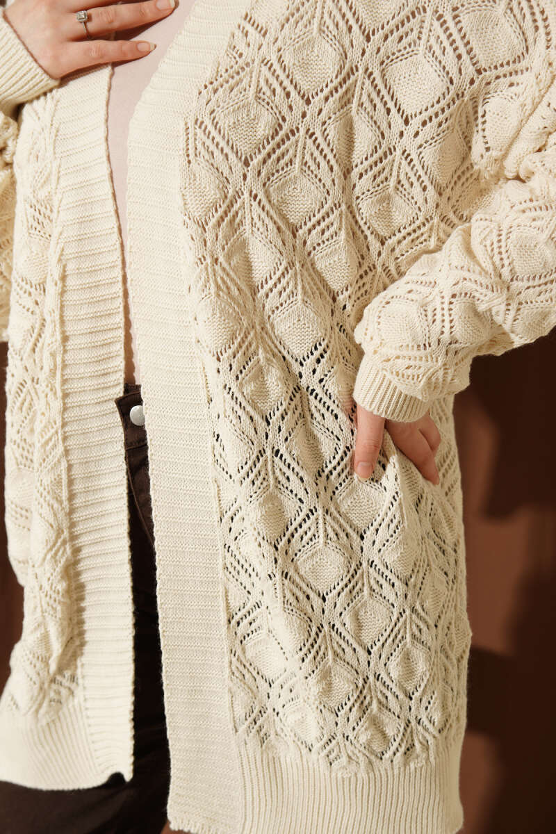 Desenli Ajurlu Triko Hırka Bej