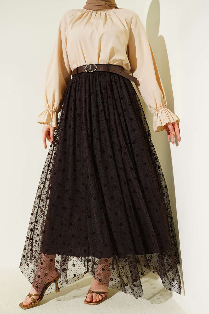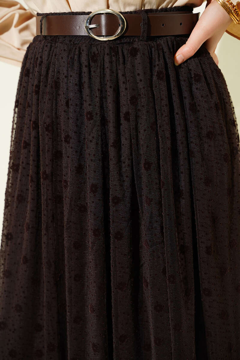 Desenli Asimetrik Kemerli Tül Etek Kahve