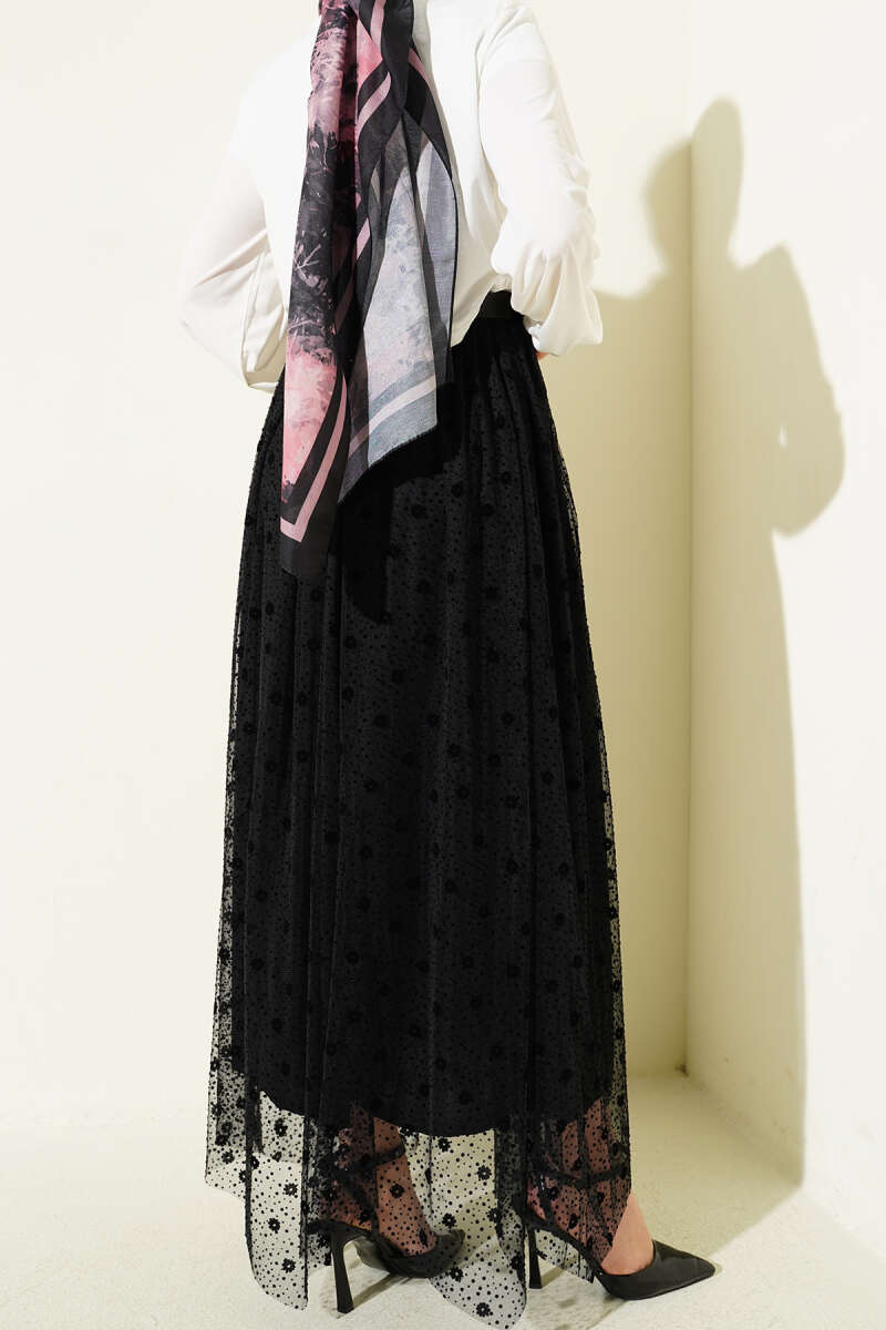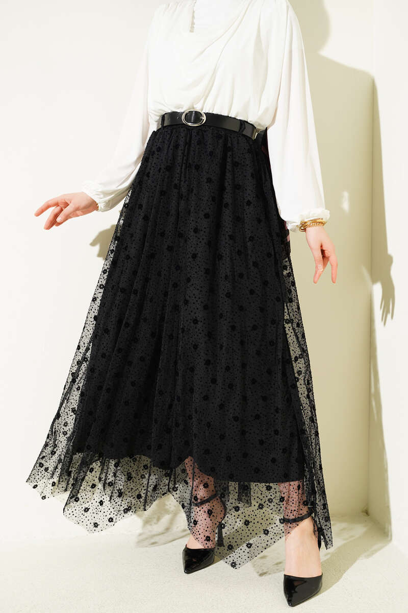Desenli Asimetrik Kemerli Tül Etek Siyah