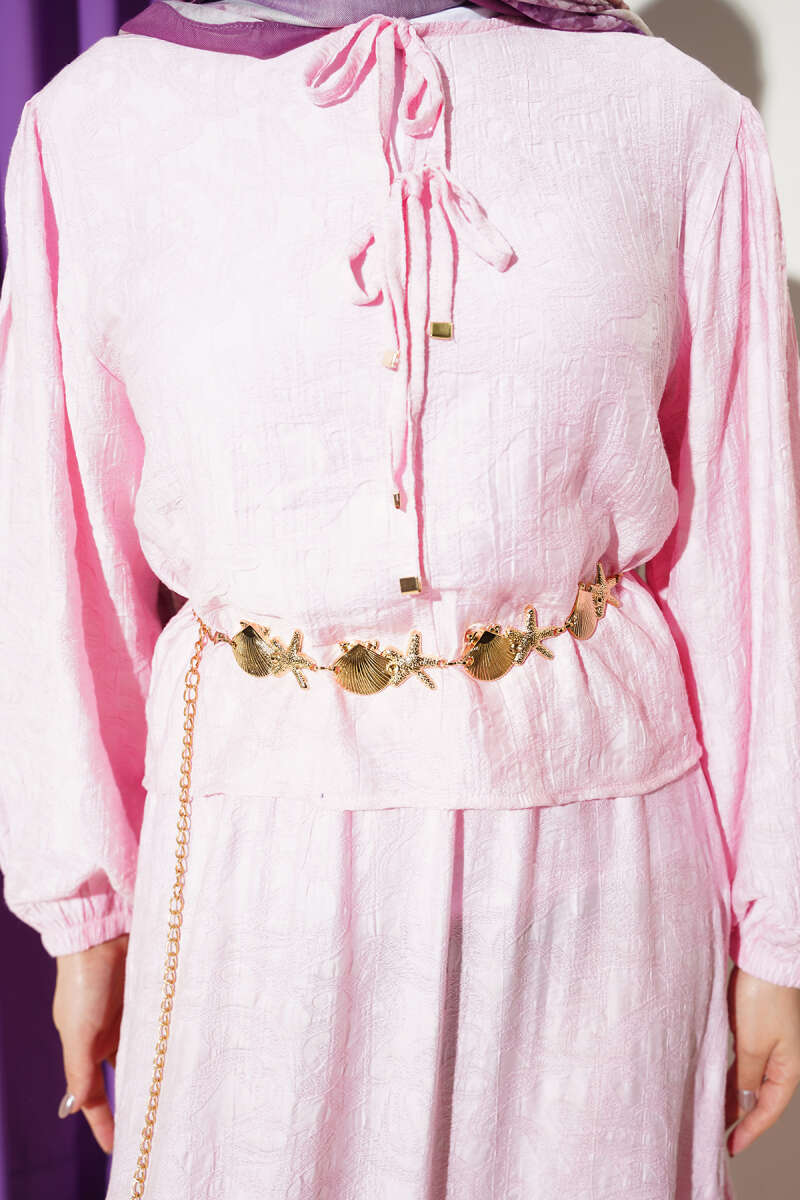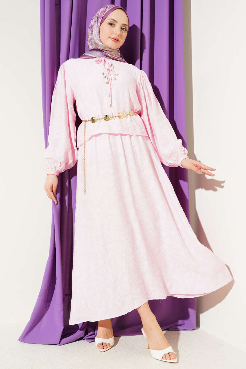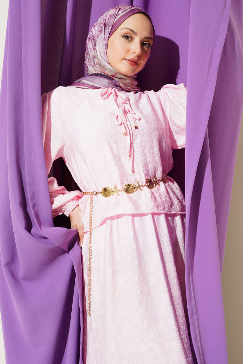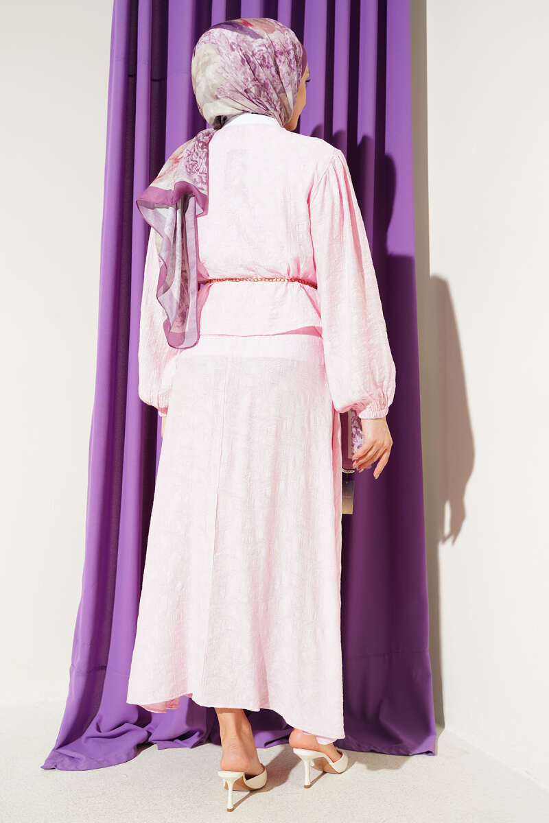 Desenli Bağlama Detaylı Etekli İkili Takım Pembe