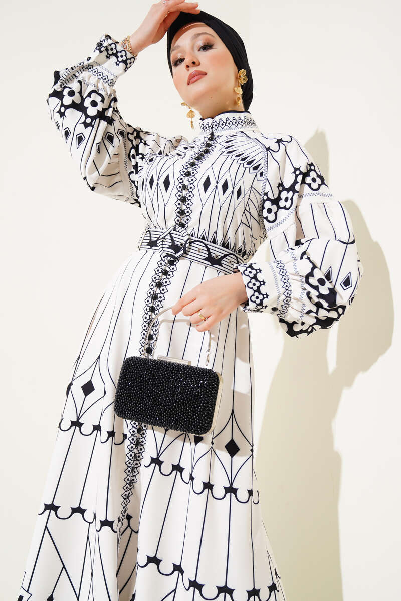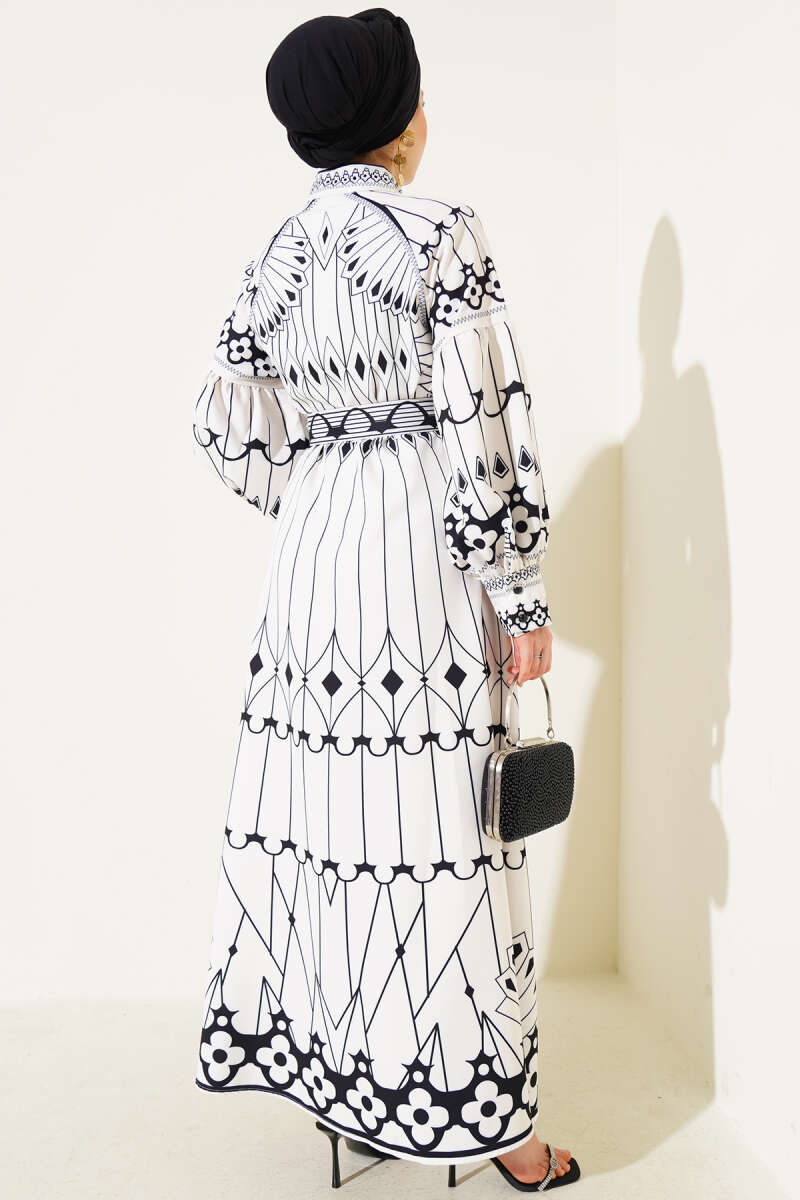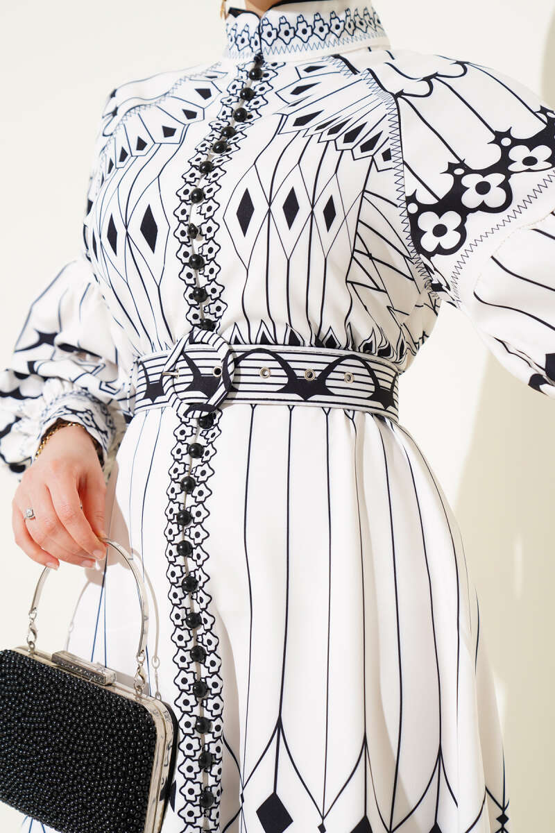 Desenli Balon Kol Boydan Mini Düğmeli Elbise Beyaz