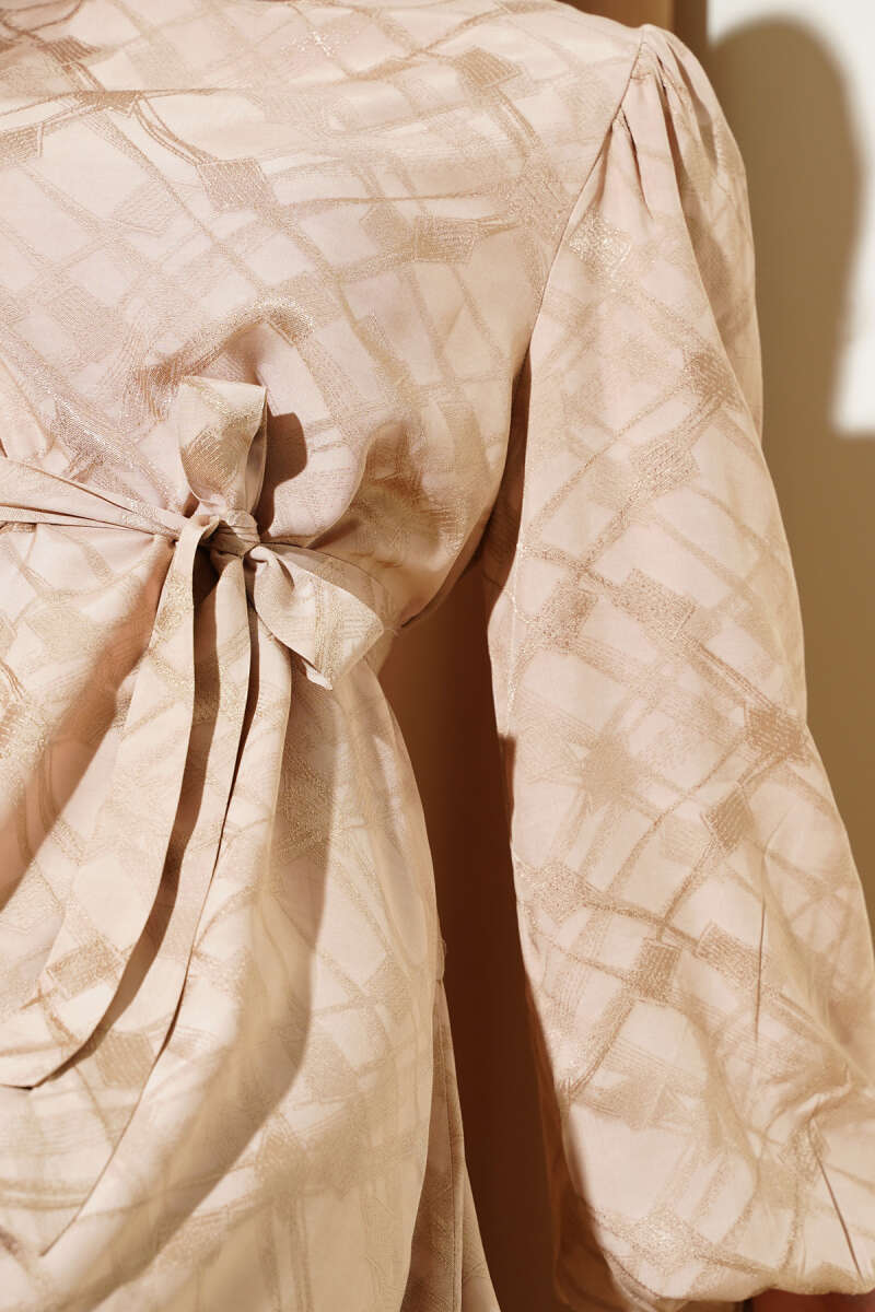 Şerit Ajur Desen Triko Elbise Bej