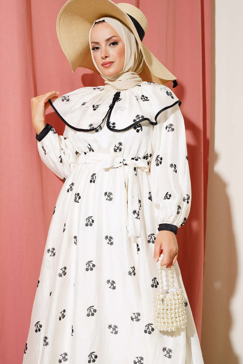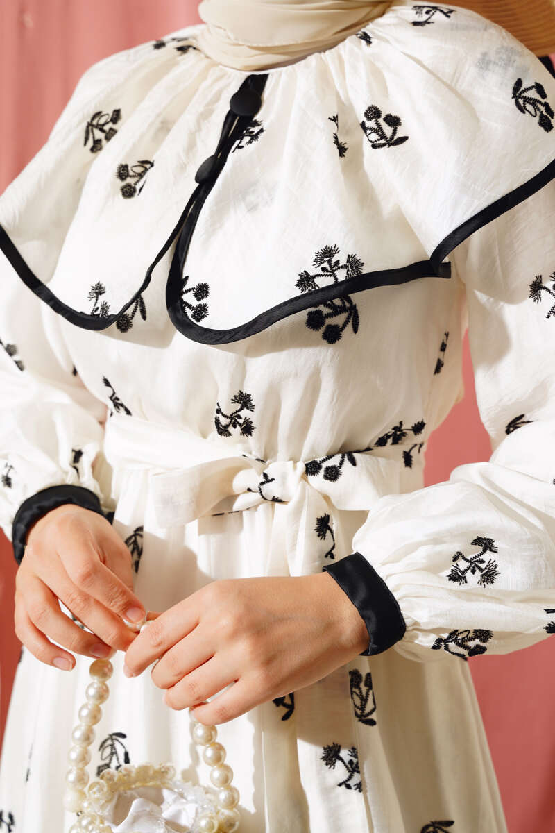Desenli Bebe Yaka Elbise Ekru