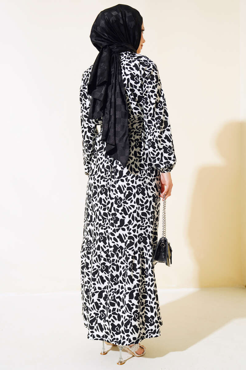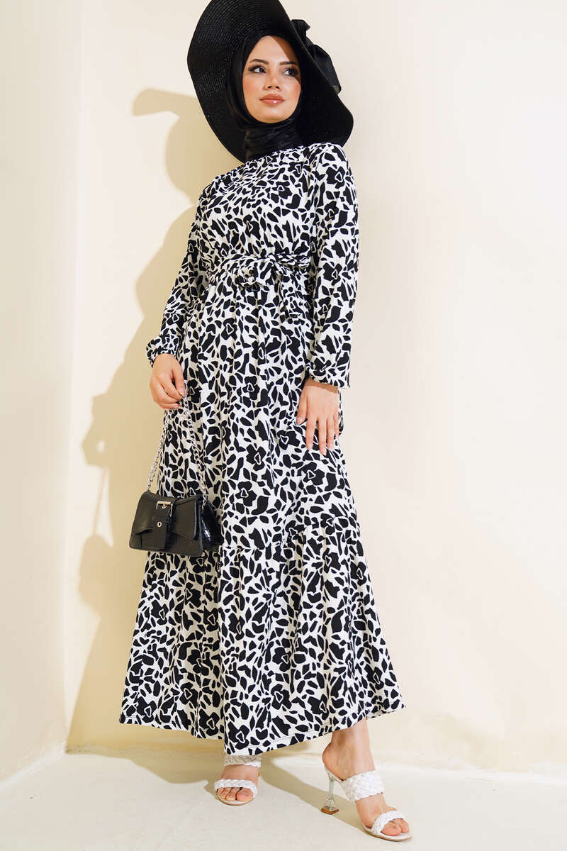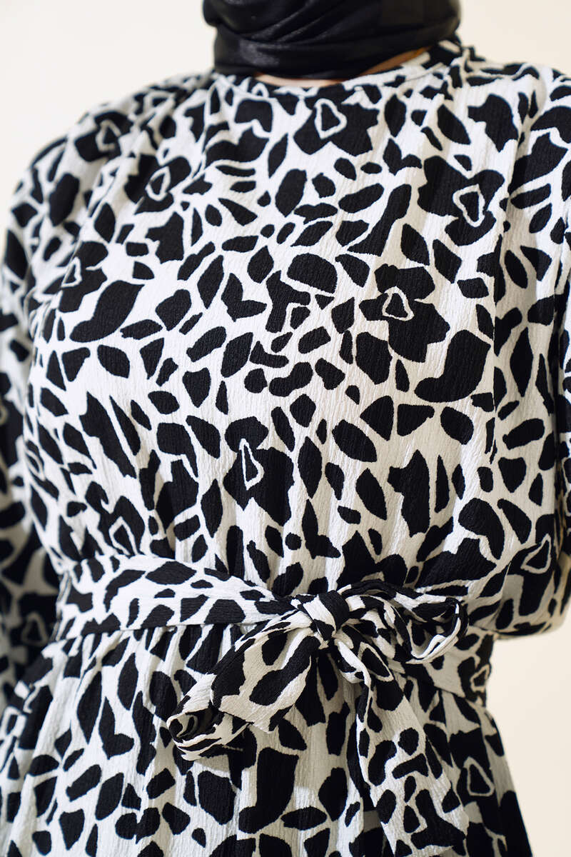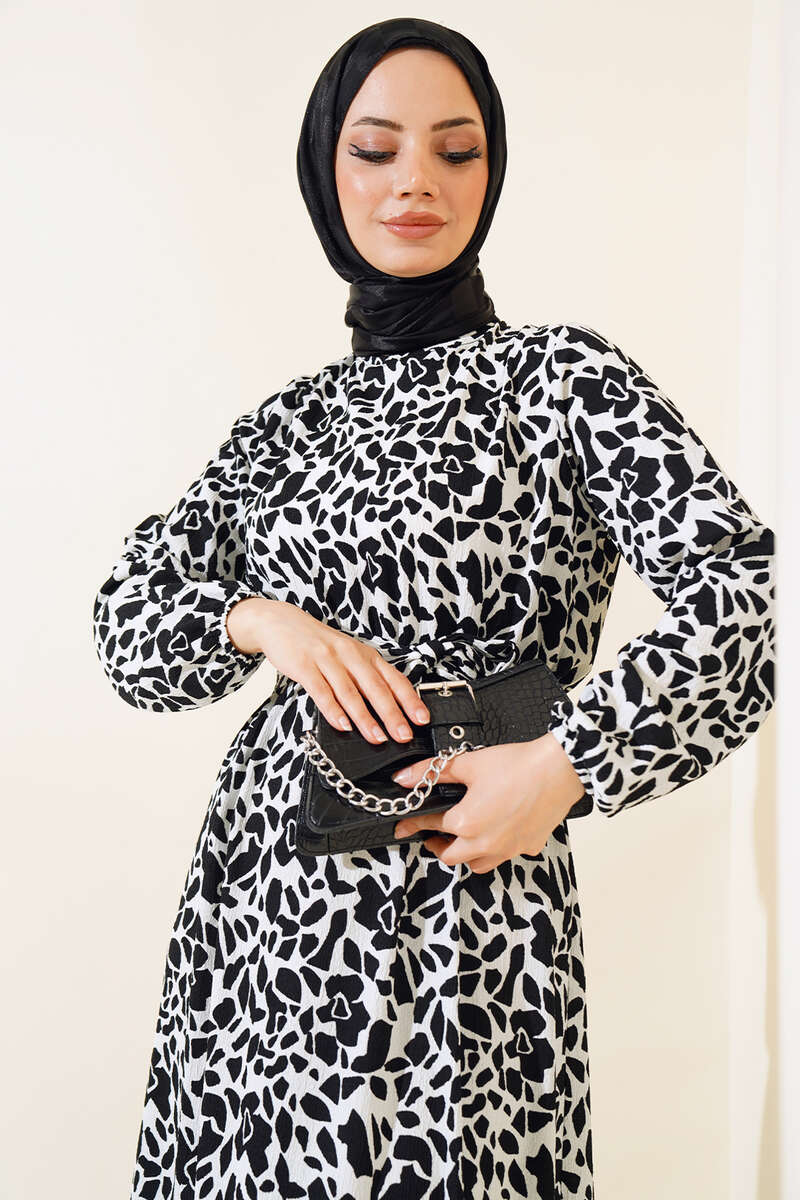 Desenli Bel Lastikli Bürümcük Elbise Siyah