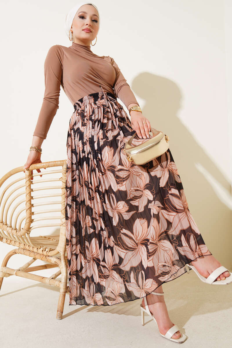 Yan Kemer Detaylı Ekoseli Etek Kahve