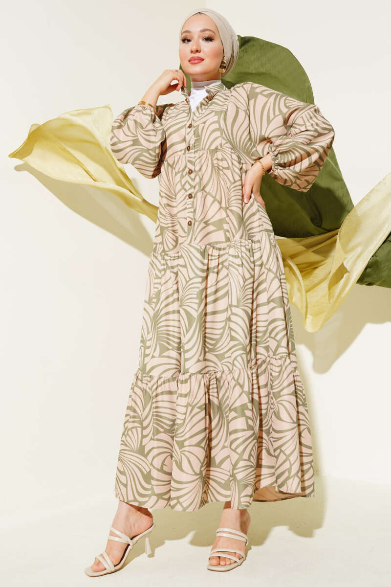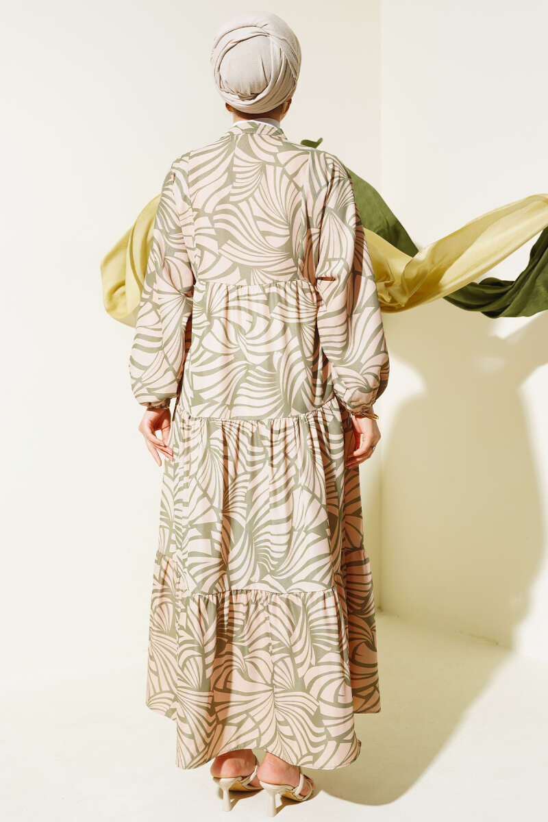 Kuşaklı Ekose Desenli Kloş Elbise Haki