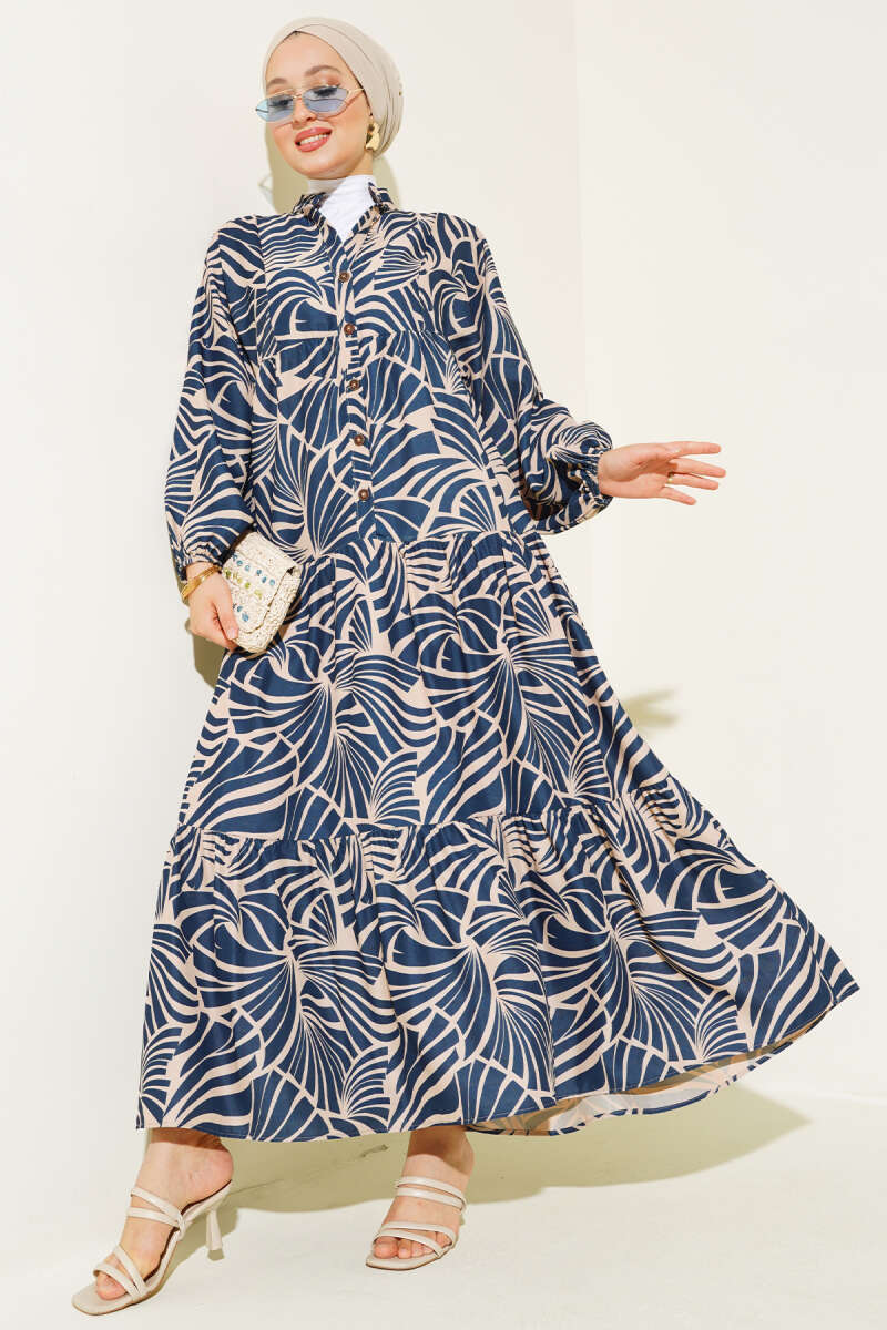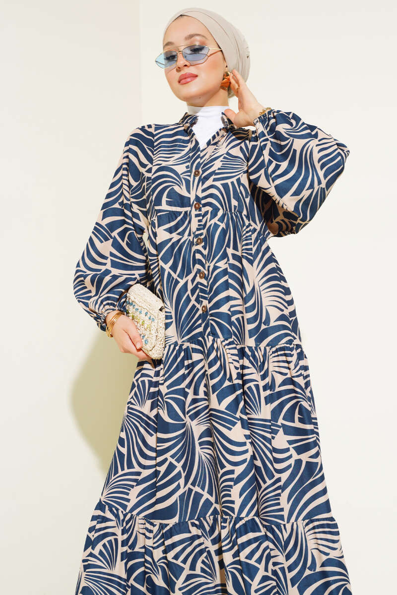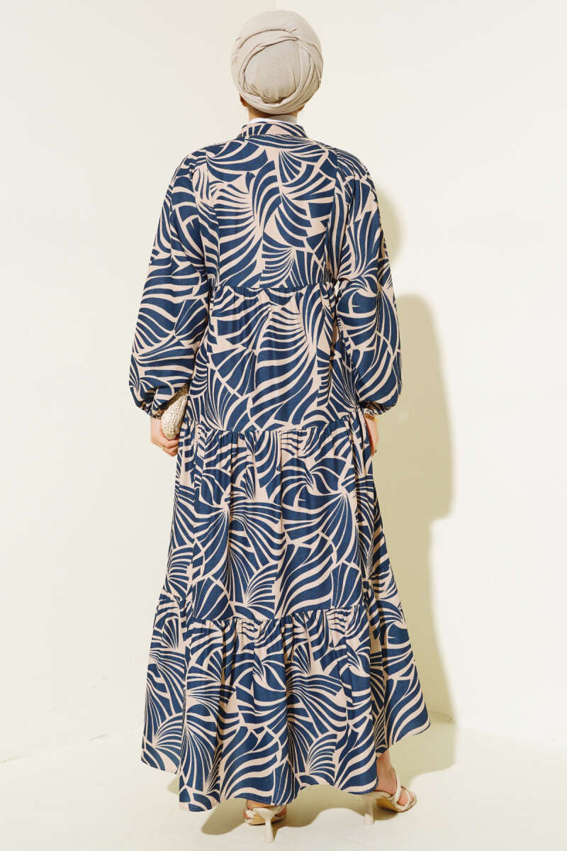 Desenli Bileği Lastikli Elbise Siyah