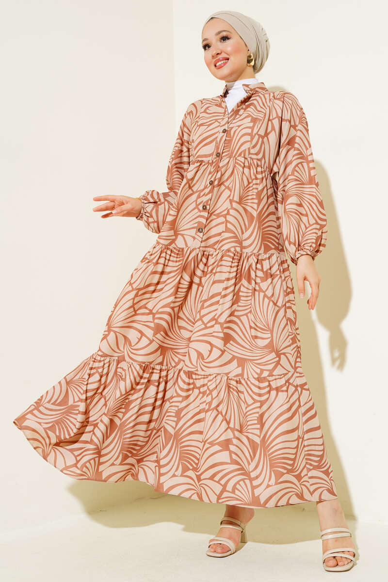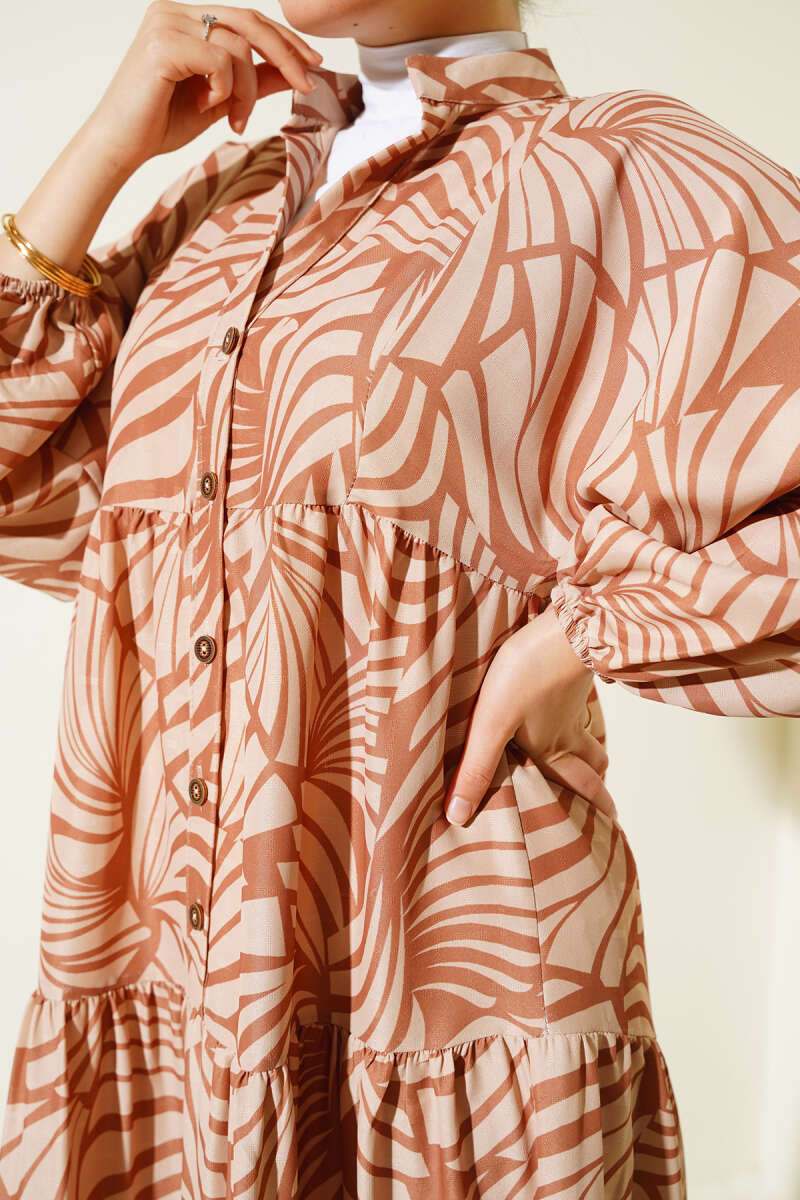 Çizgi Gömlek Garnili Triko Elbise Kahve Bej