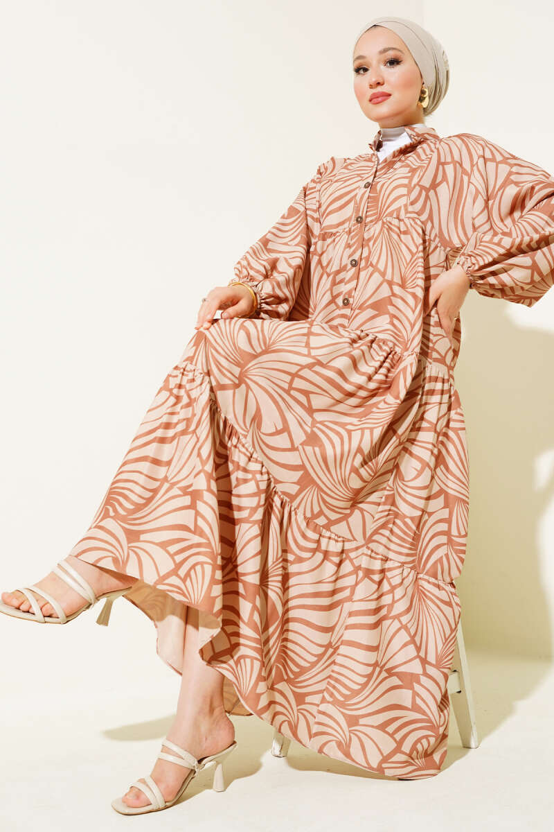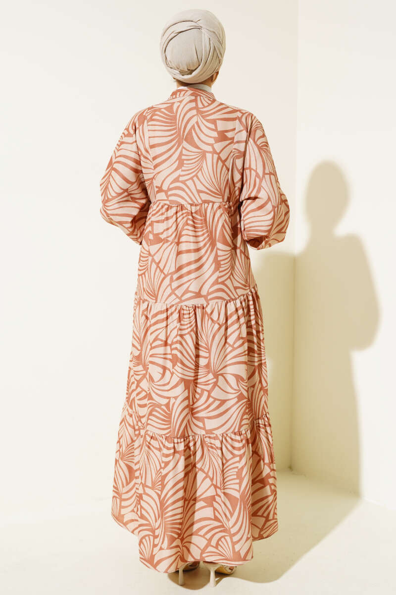 Kuşaklı Ekose Desenli Kloş Elbise Kahve
