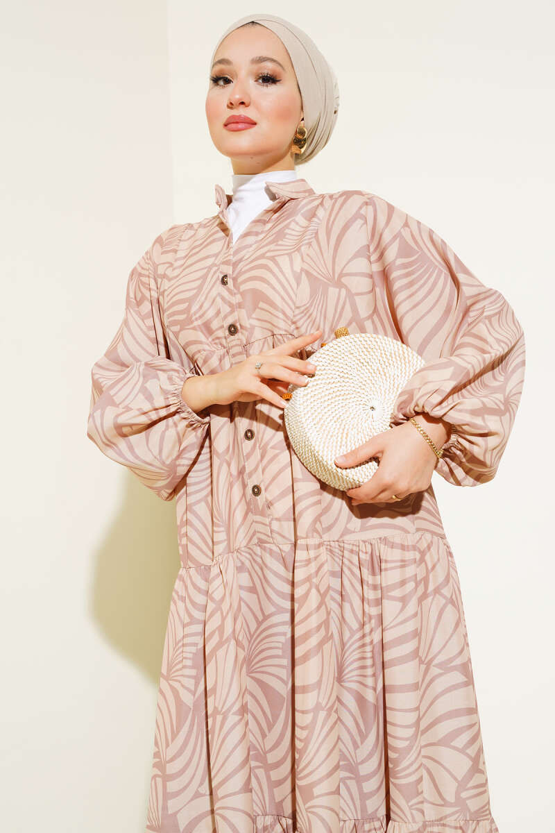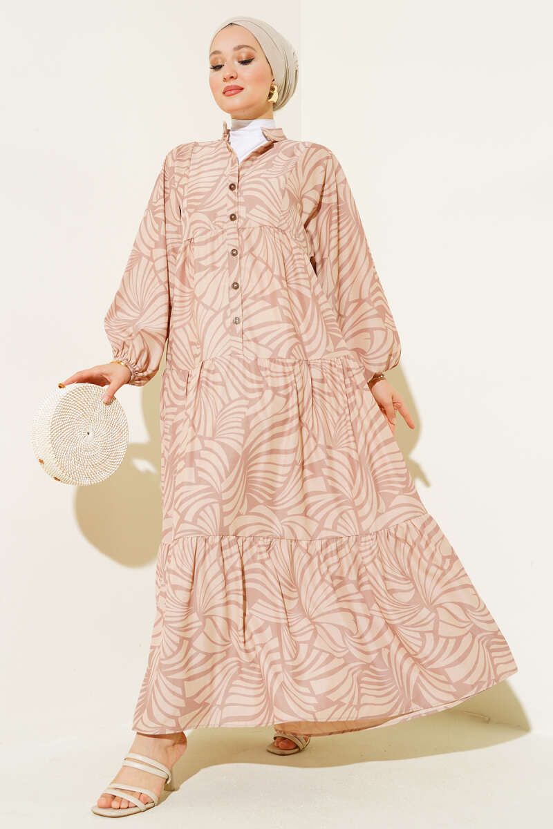 Çizgi Gömlek Garnili Triko Elbise Kahve Bej