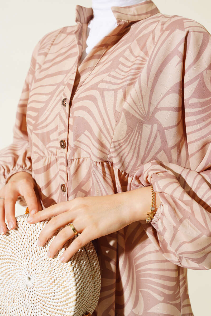 Çizgi Gömlek Garnili Triko Elbise Bej
