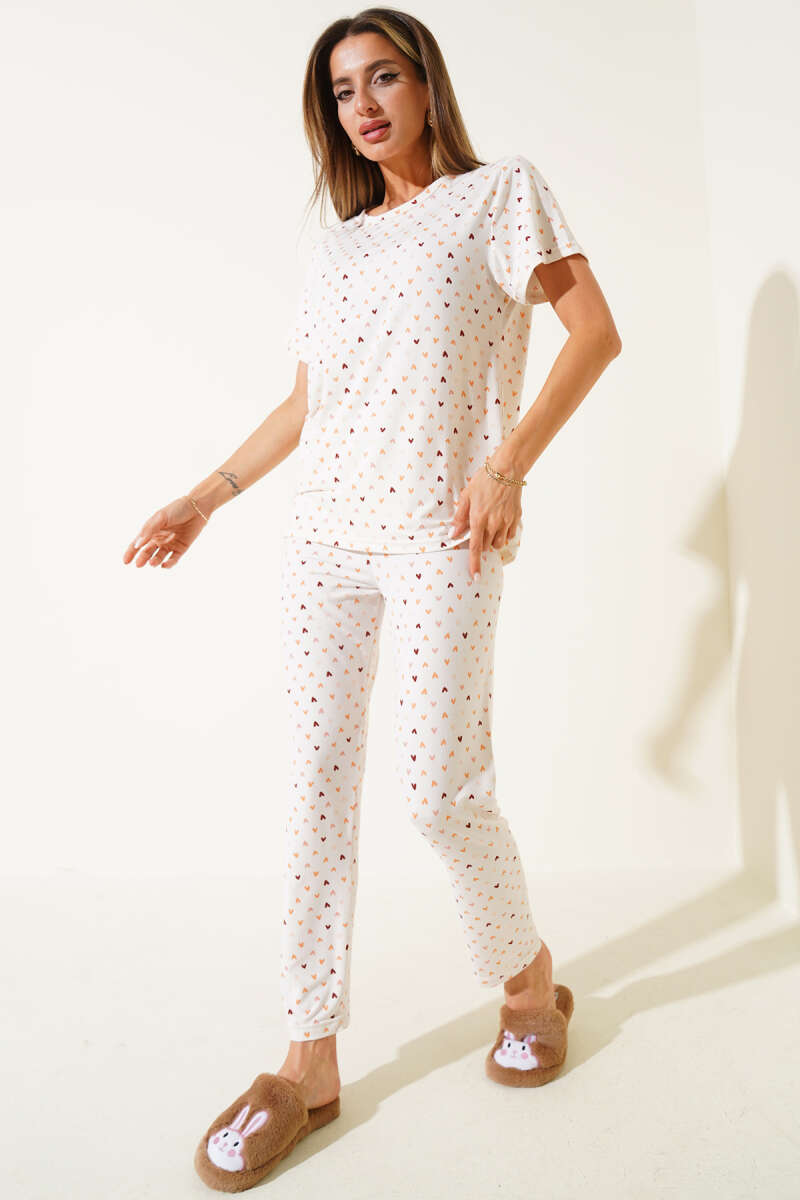 Desenli Bisiklet Yaka Pijama Takımı Ekru