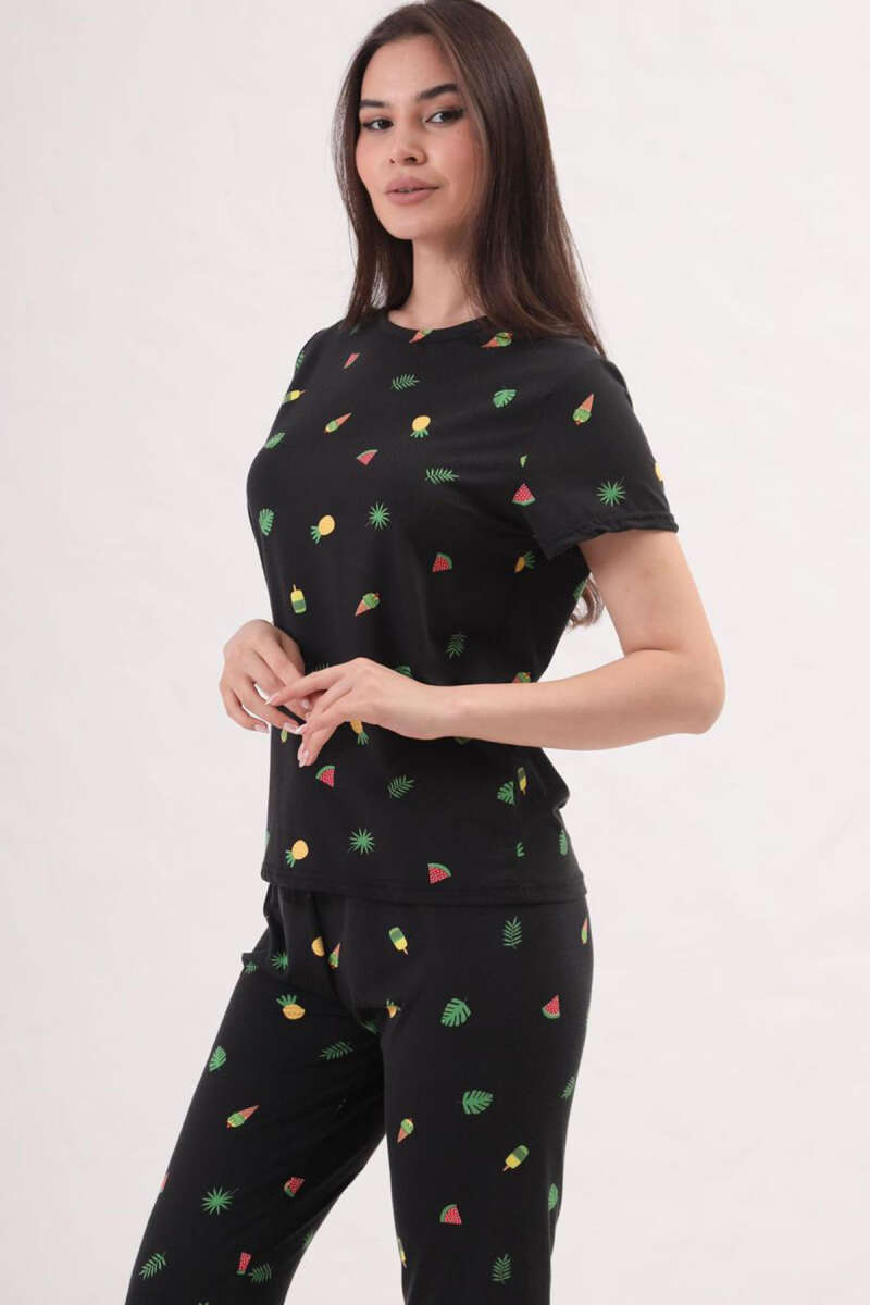 Desenli Bisiklet Yaka Pijama Takımı Siyah Yeşil