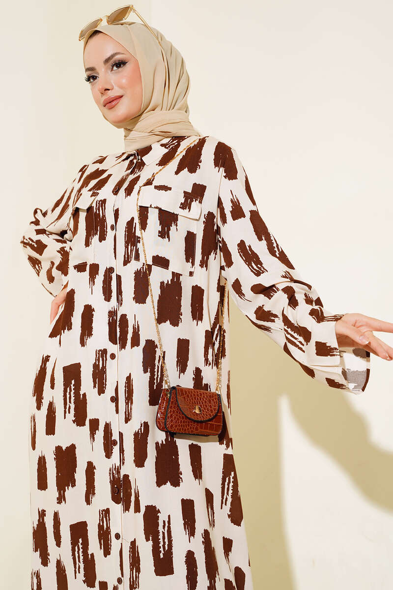 Desenli Cepli Elbise Bej Kahve