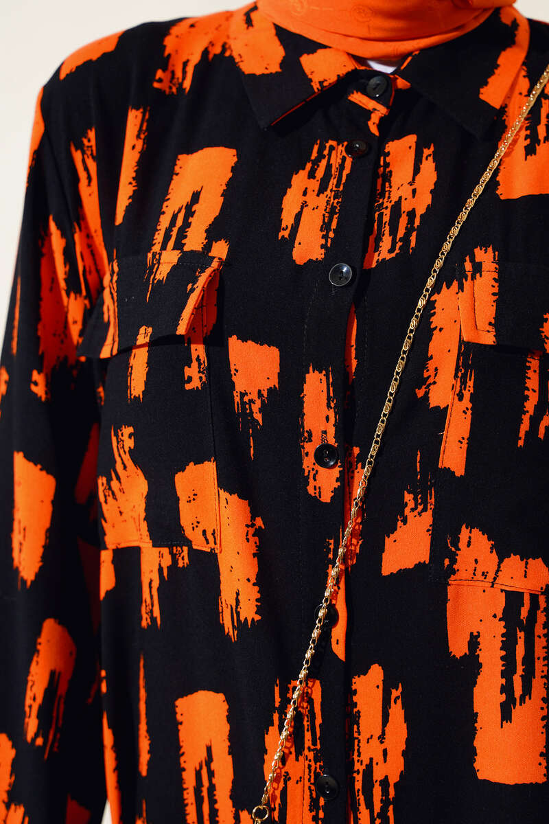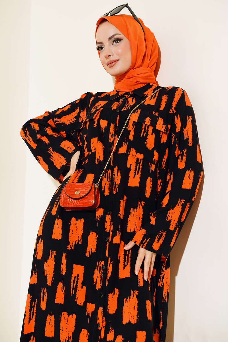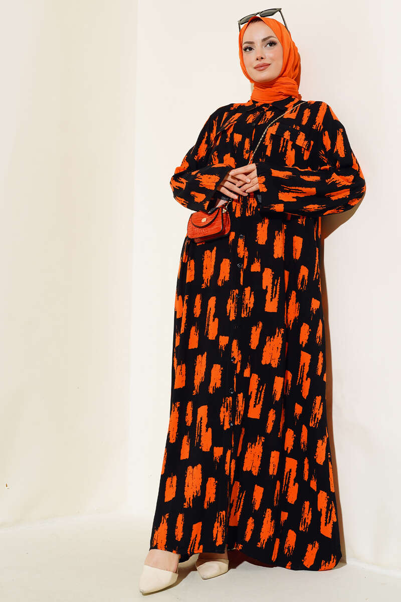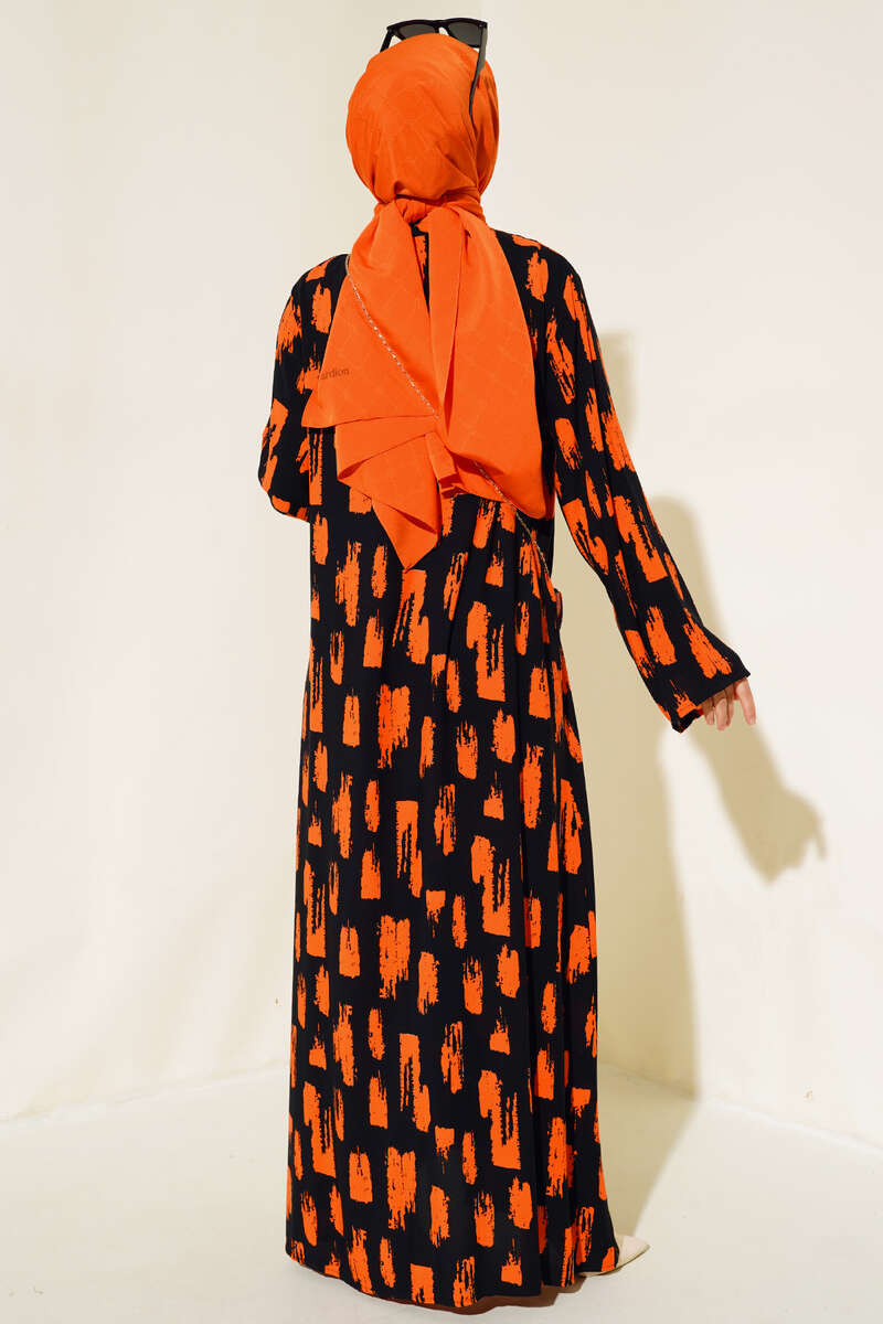 Desenli Cepli Elbise Siyah Oranj