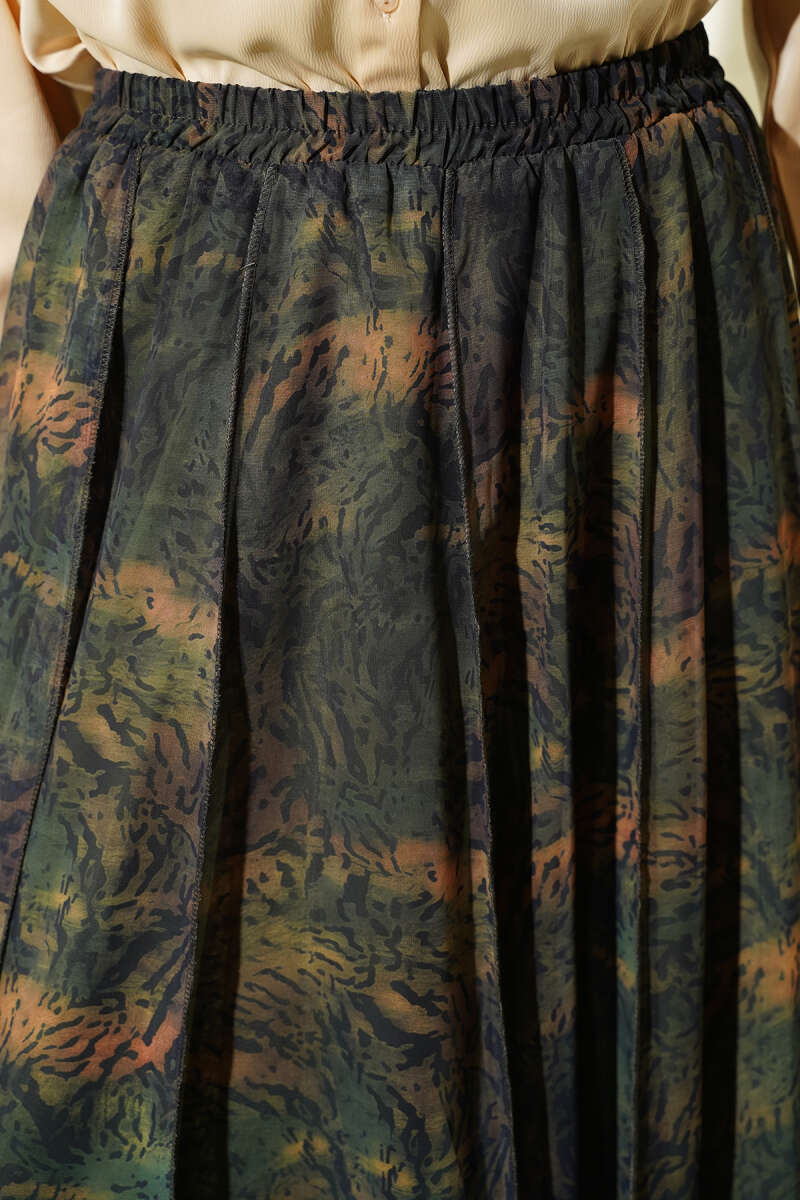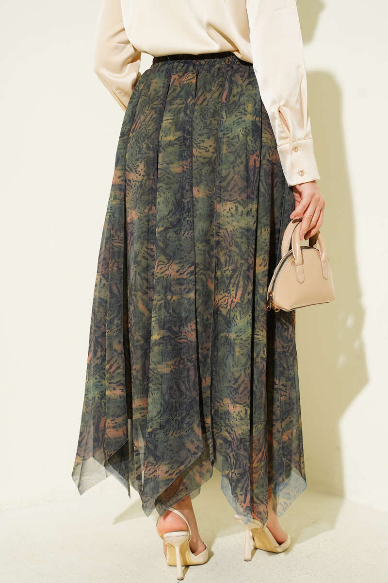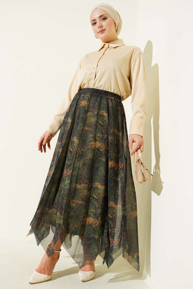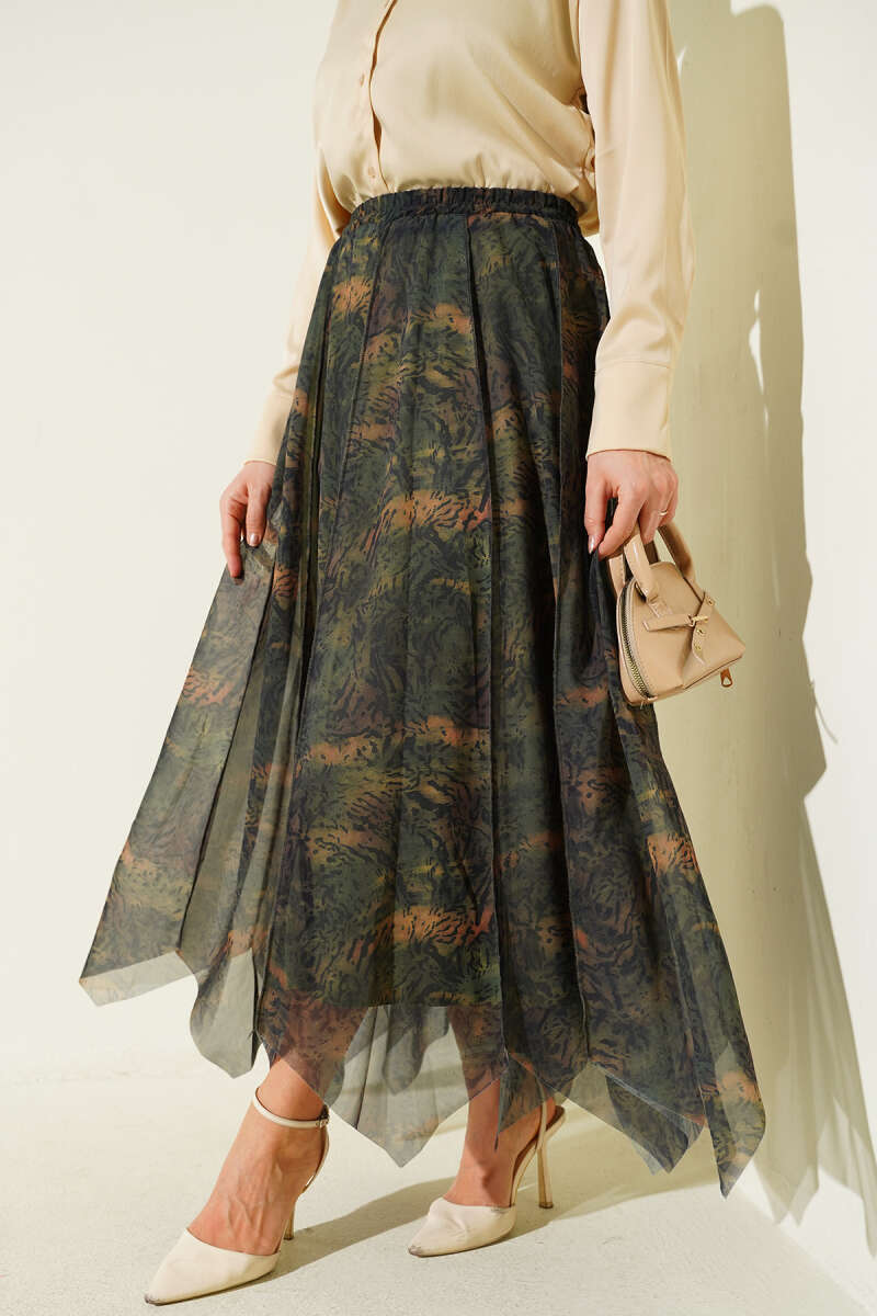 Desenli Dikişli Asimetrik Şifon Etek Haki