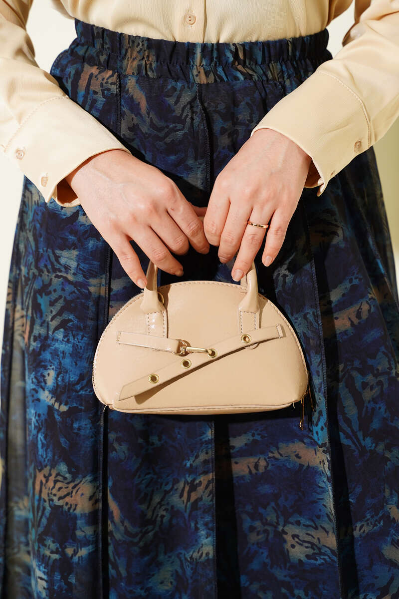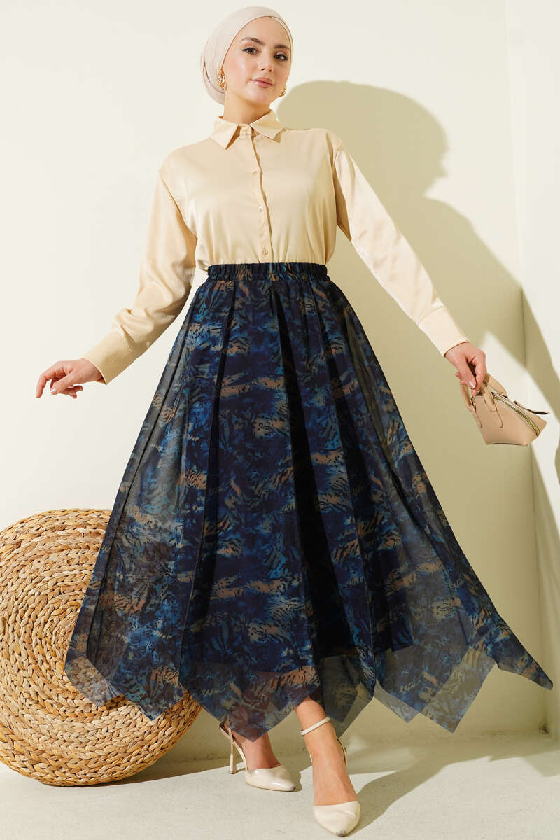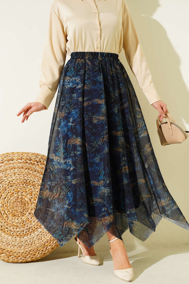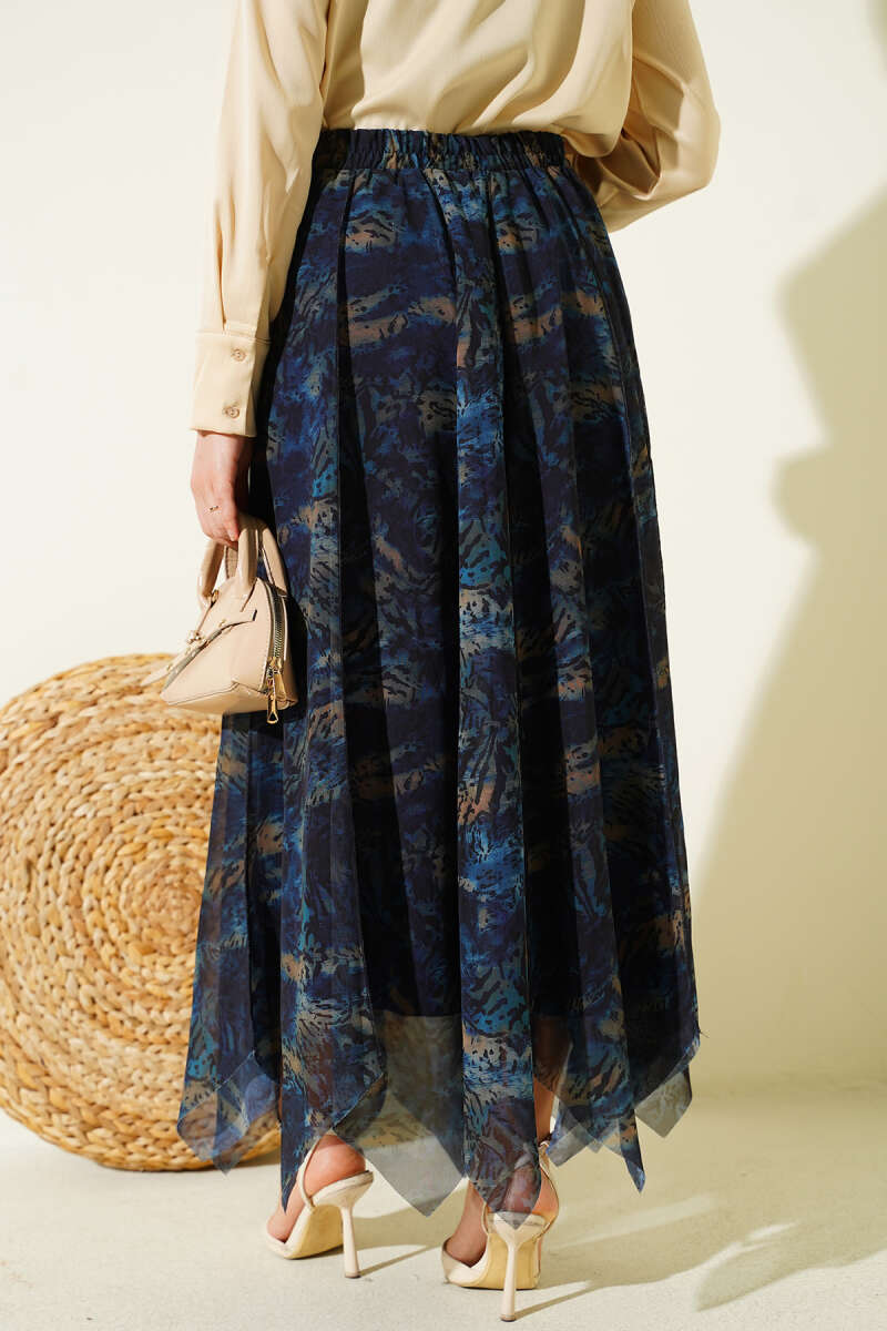 Desenli Dikişli Asimetrik Şifon Etek Lacivert