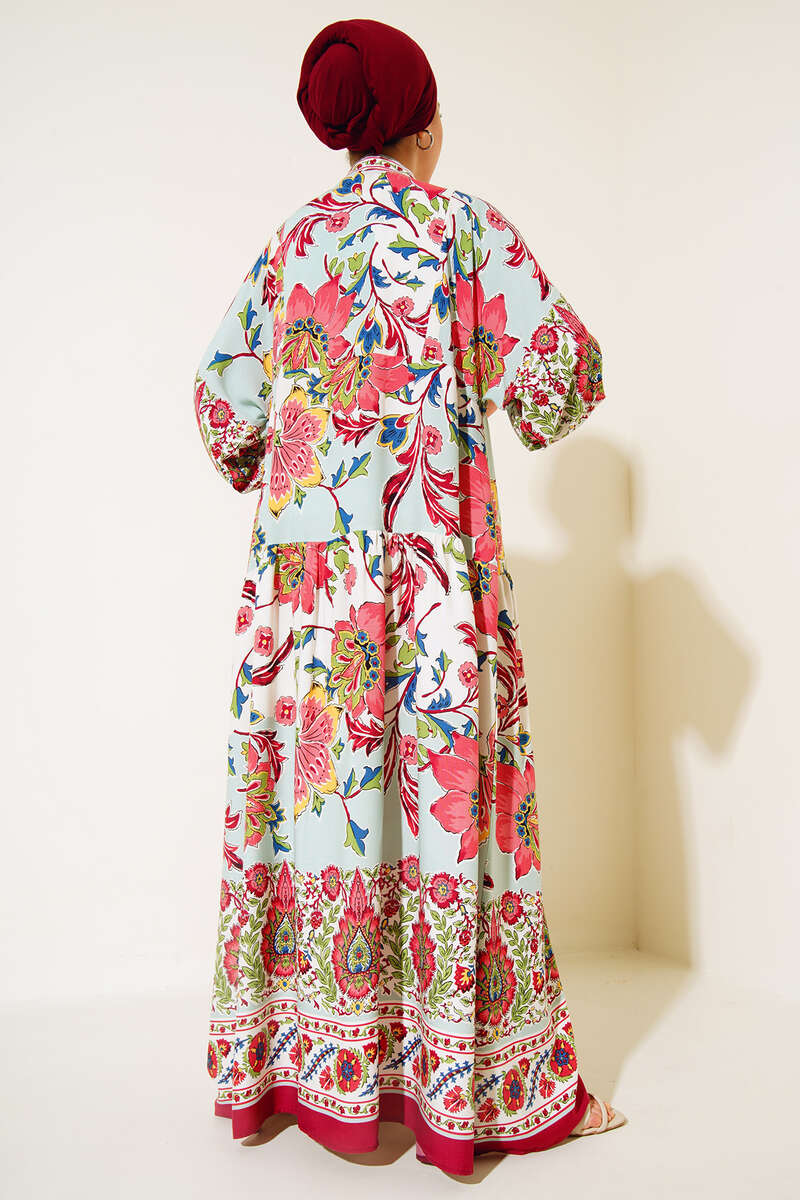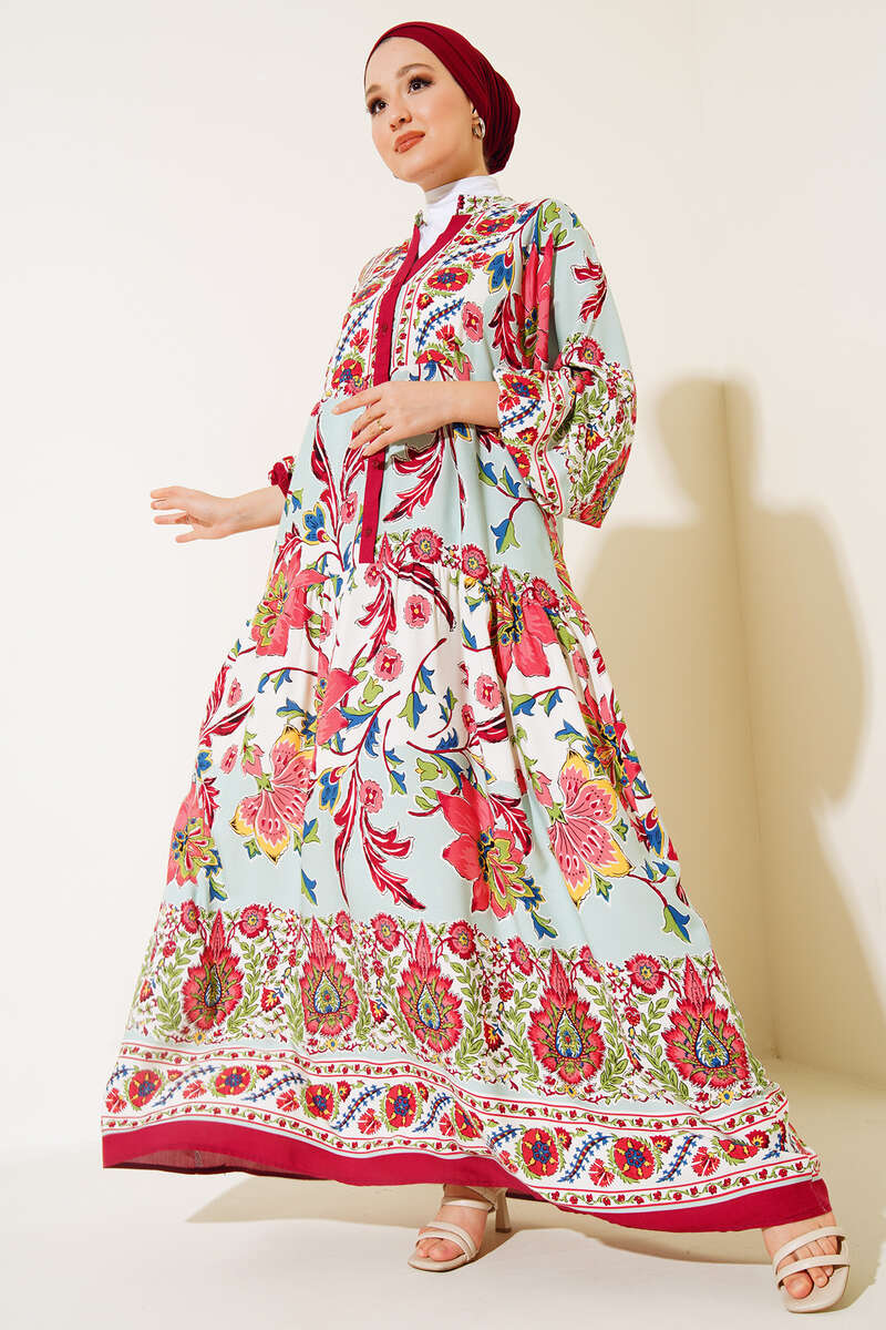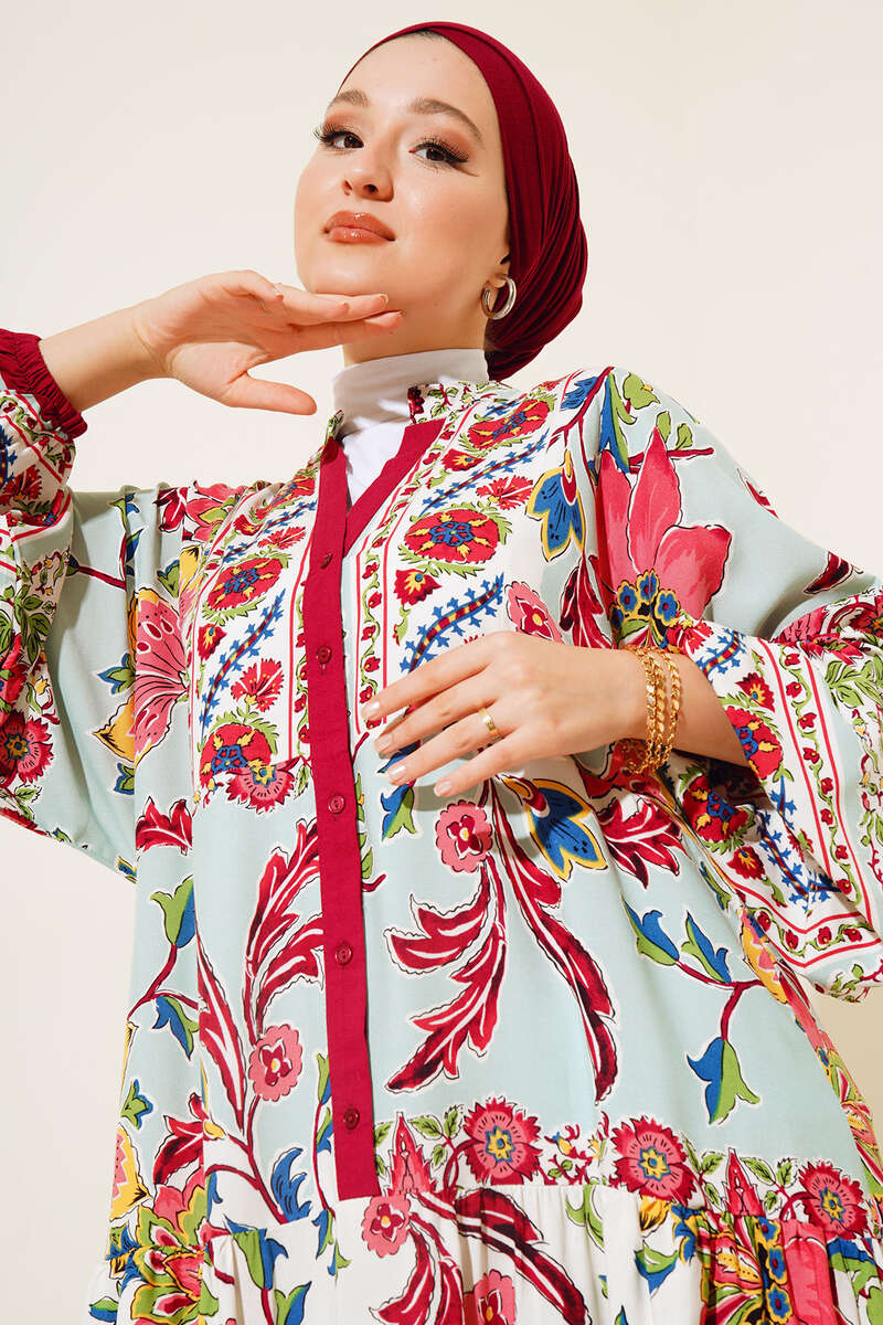 Desenli Düğme Patlı Viskon Elbise Bordo Mint