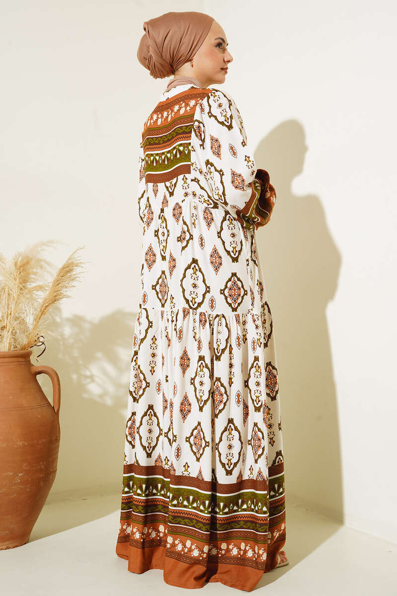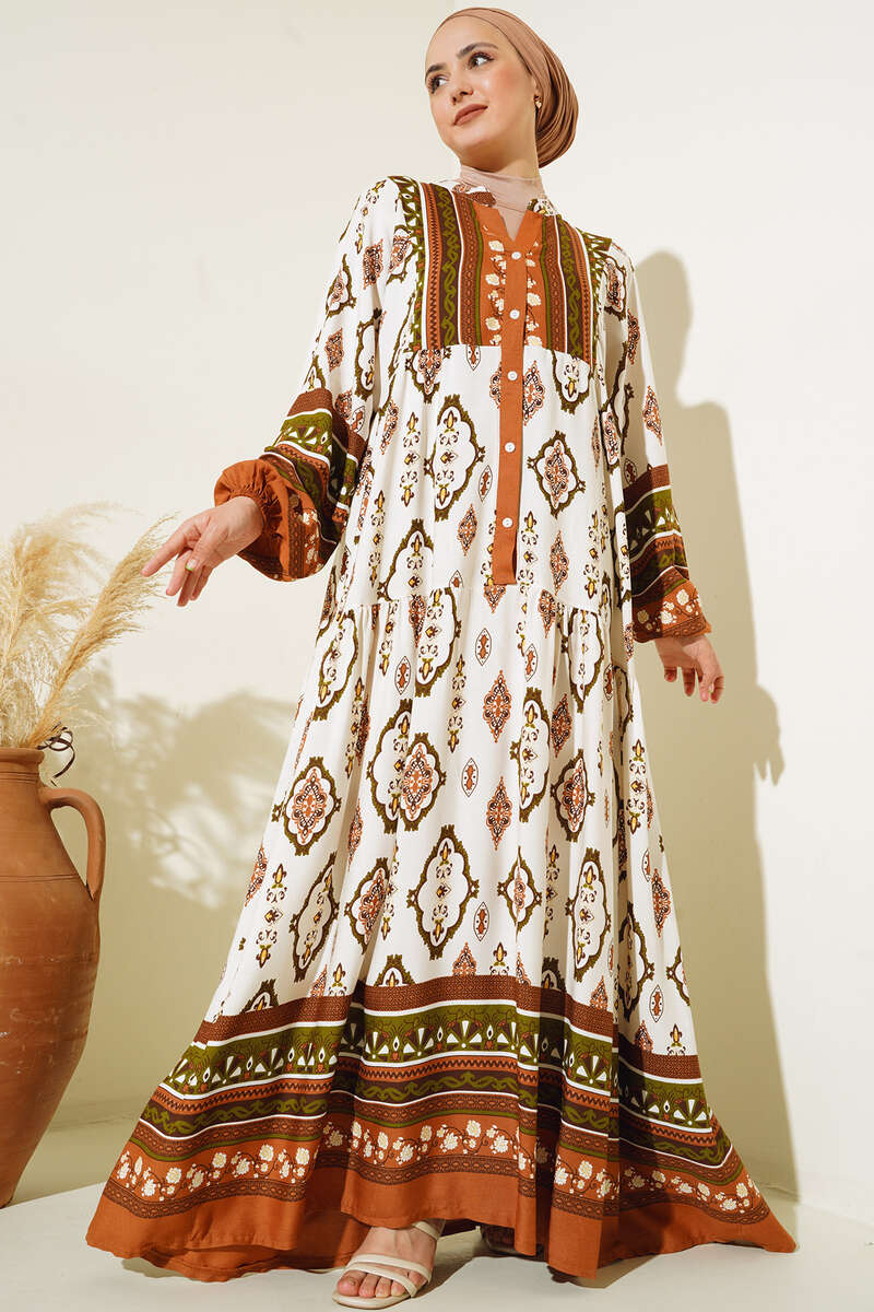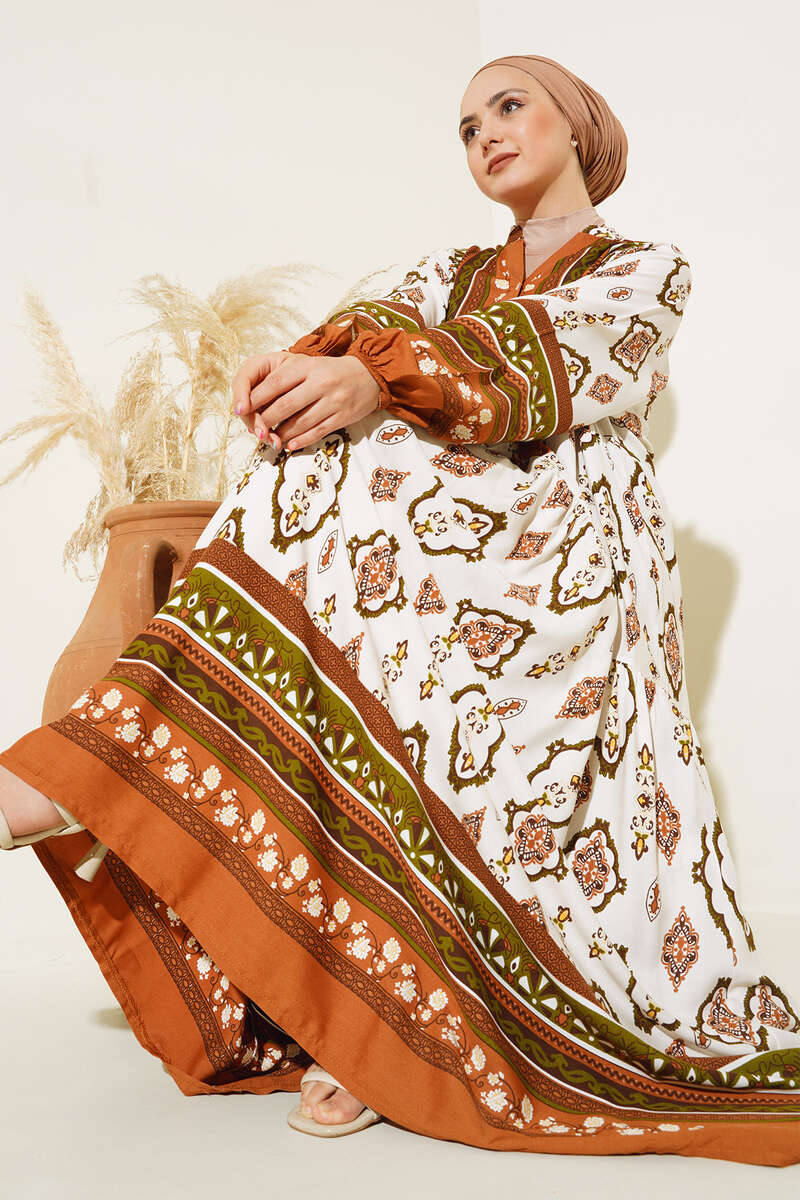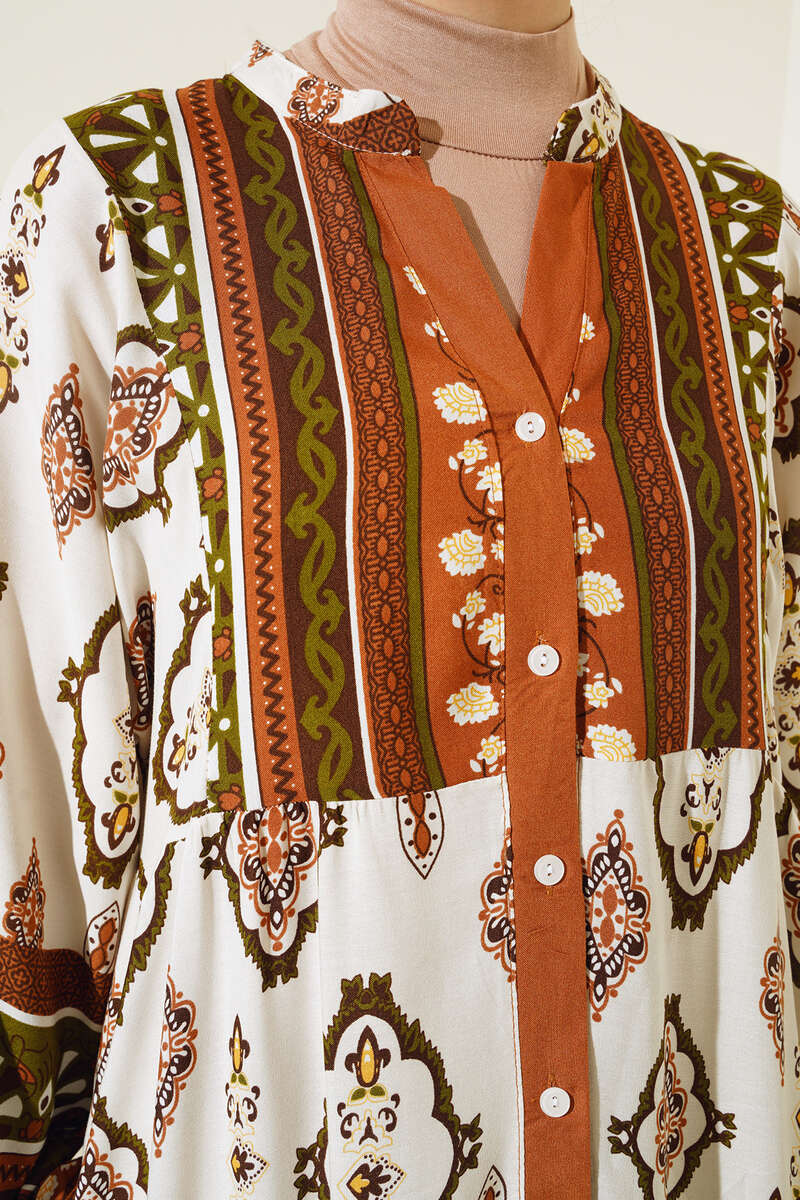 Desenli Düğme Patlı Viskon Elbise Kahve