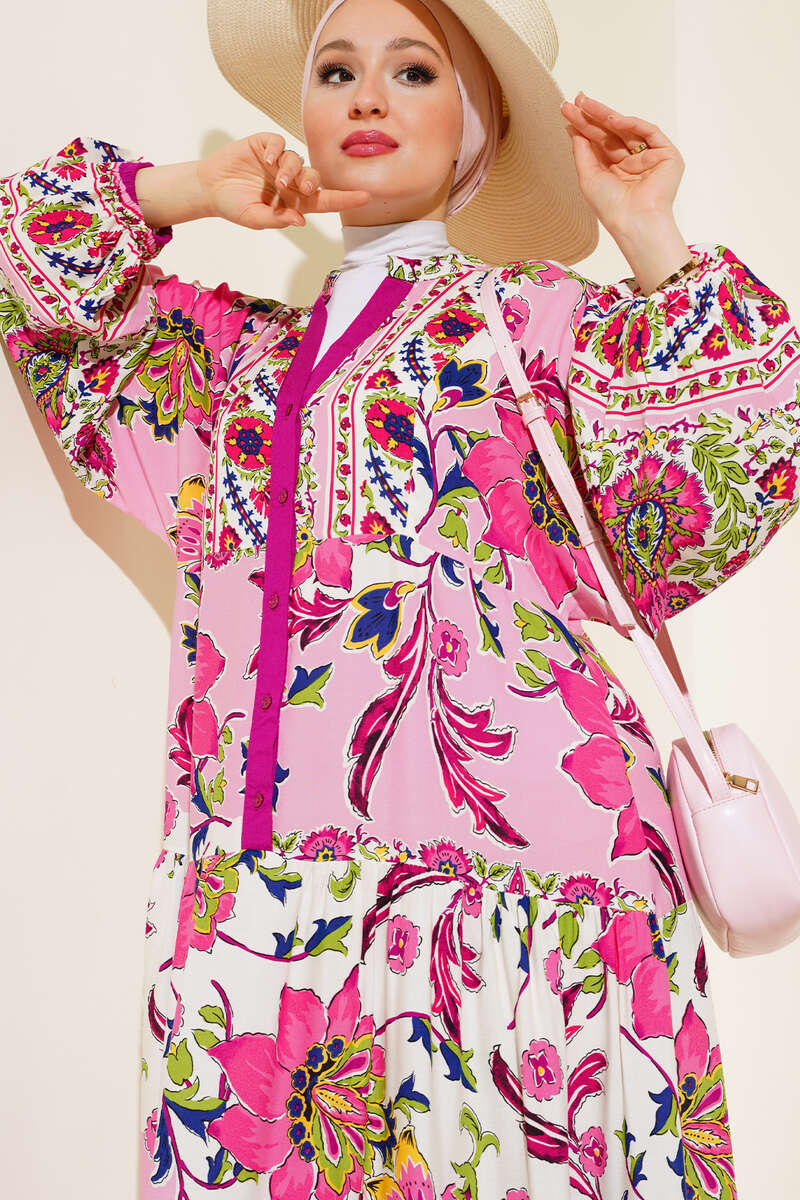Yeni sezon elbisemiz desenleriyle favoriler arasındadır. Düğme patlı elbisemizin bilekleri lastiklidir. Şık ve sporitif bir görünüm sunan elbisemiz dolabınızın vazgeçilmez parçası olacaktır.