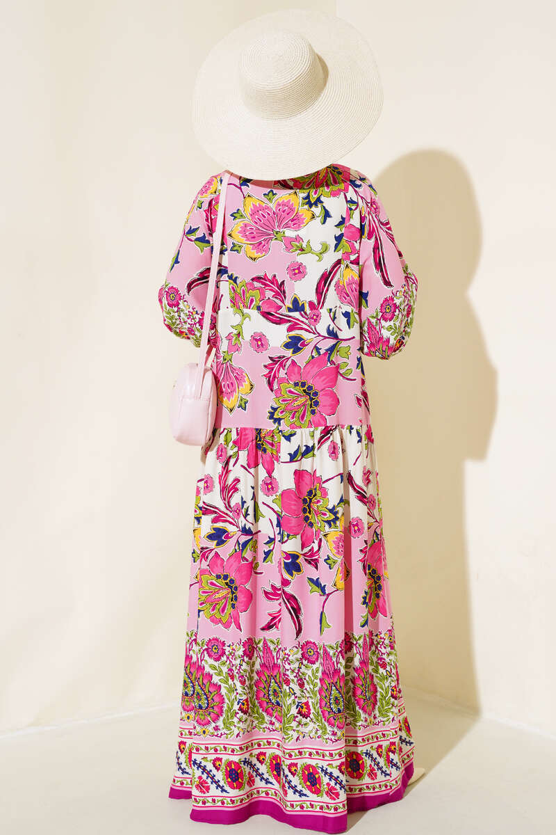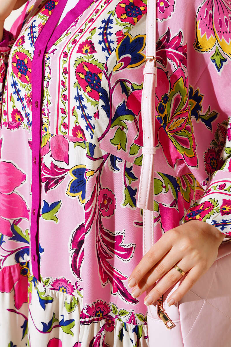 Desenli Düğme Patlı Viskon Elbise Menekşe