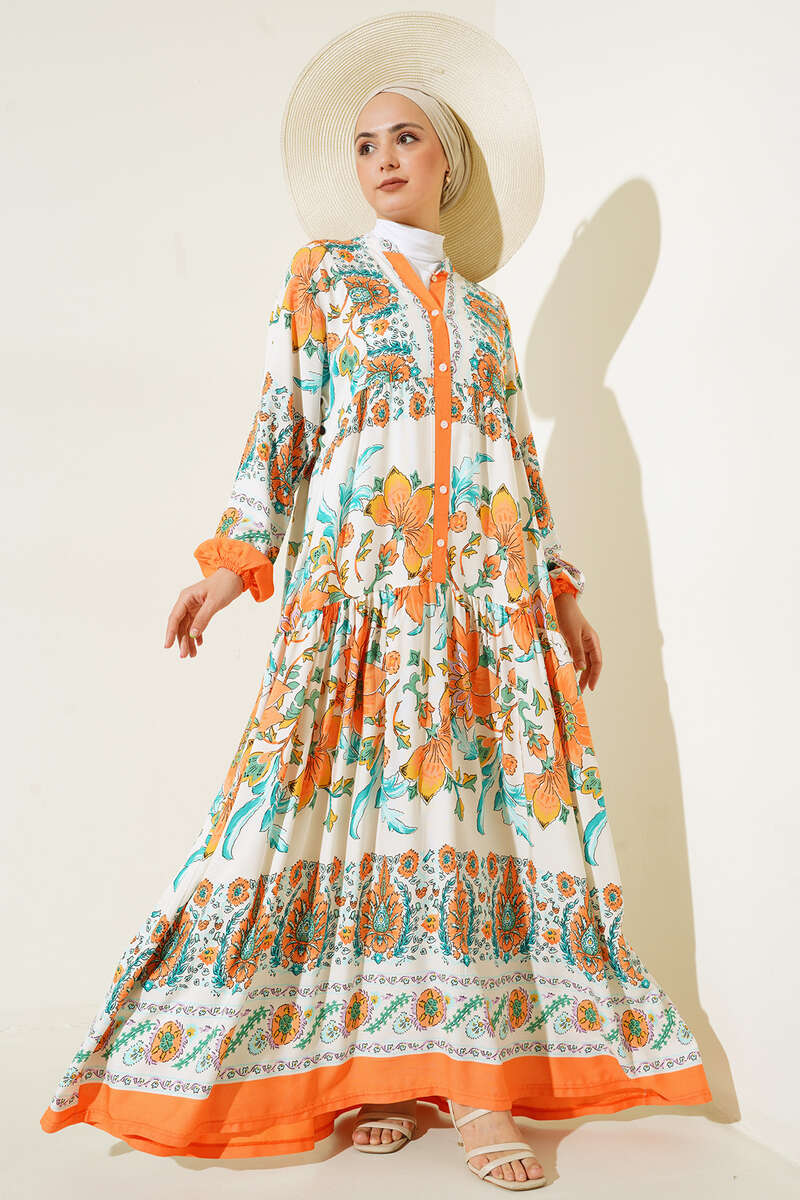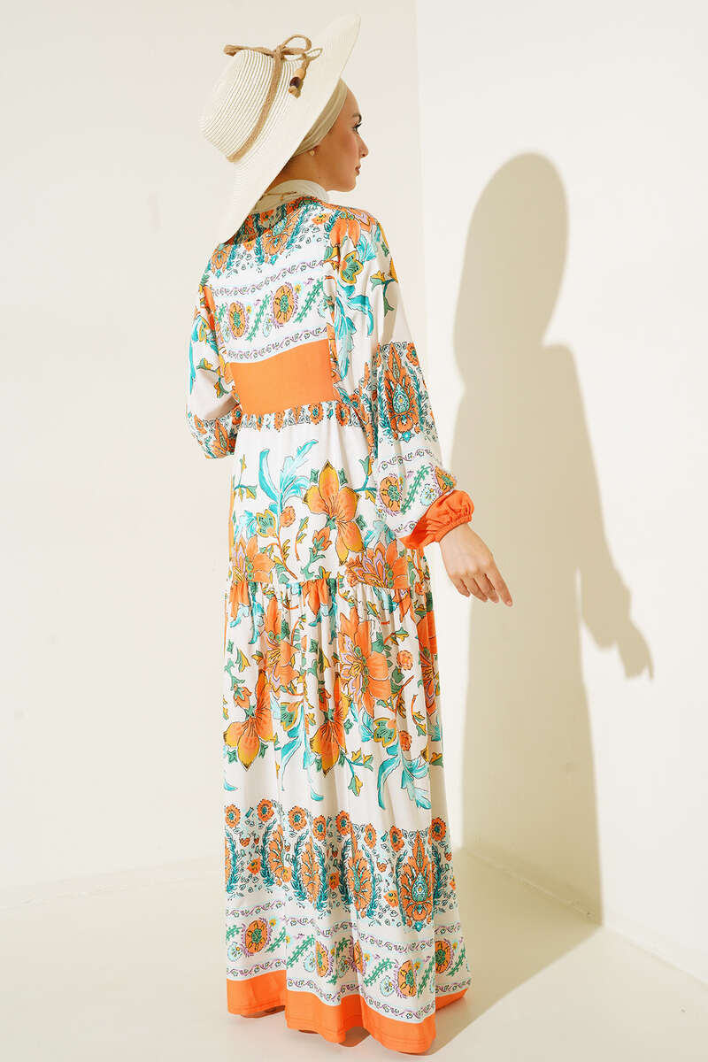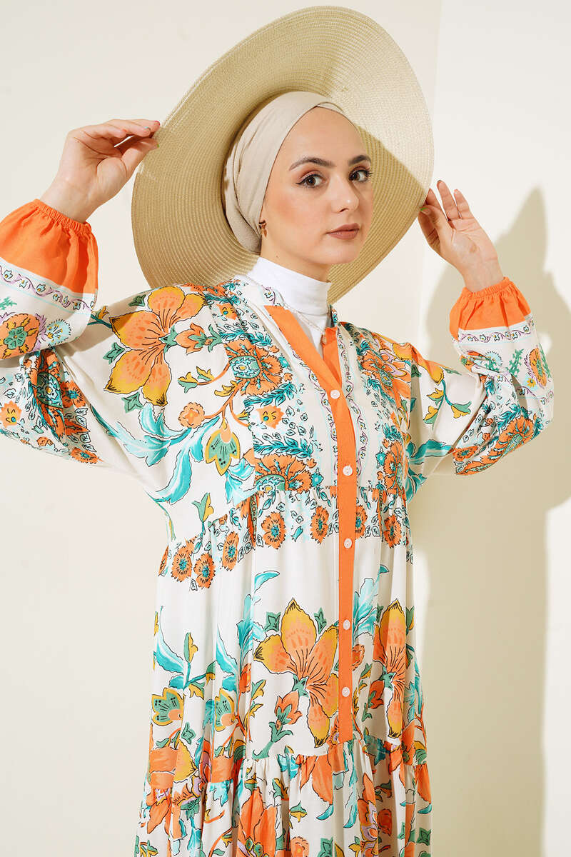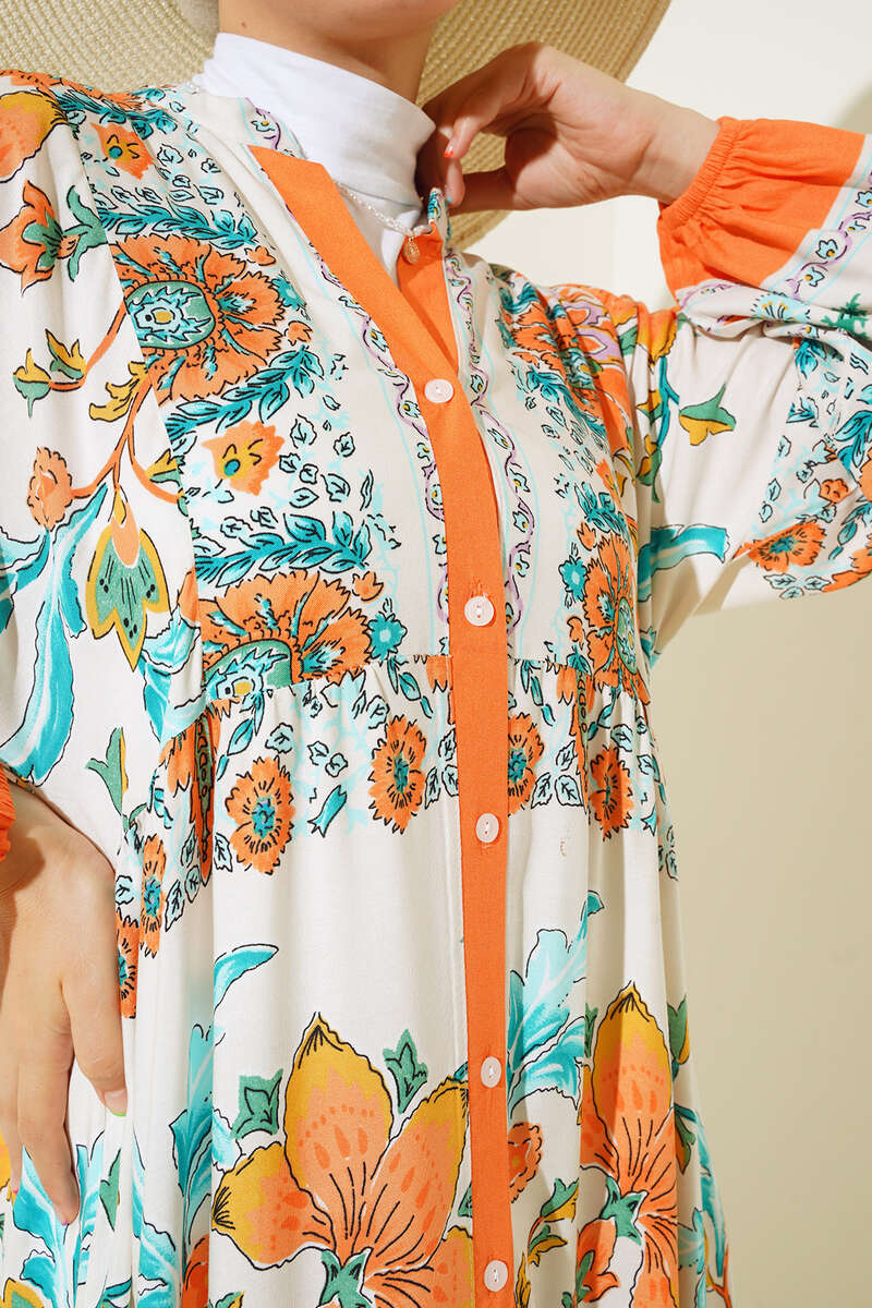 Desenli Düğme Patlı Viskon Elbise Oranj