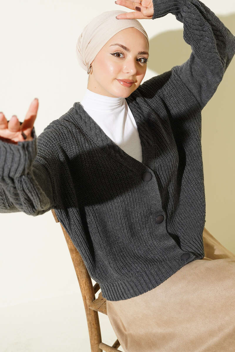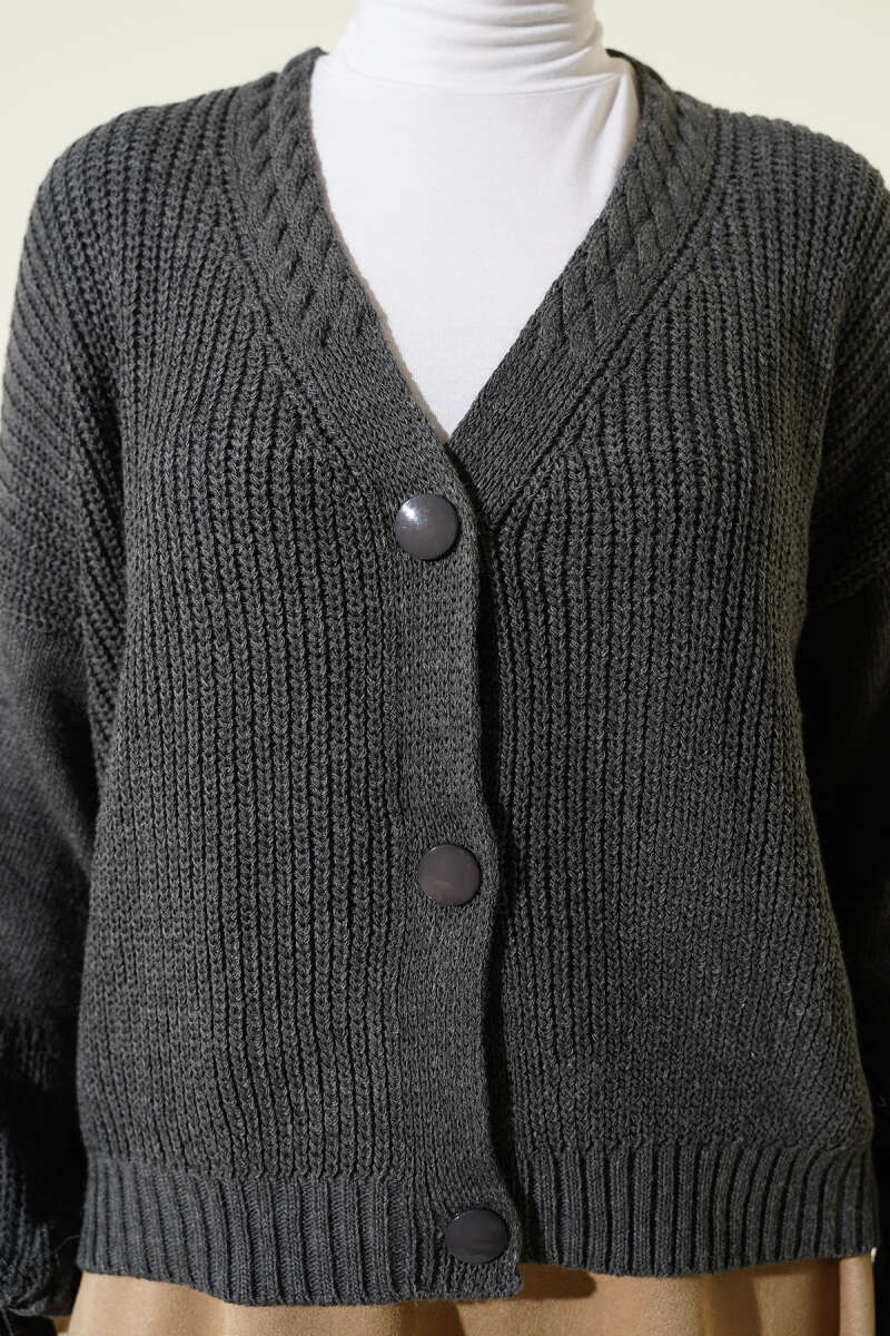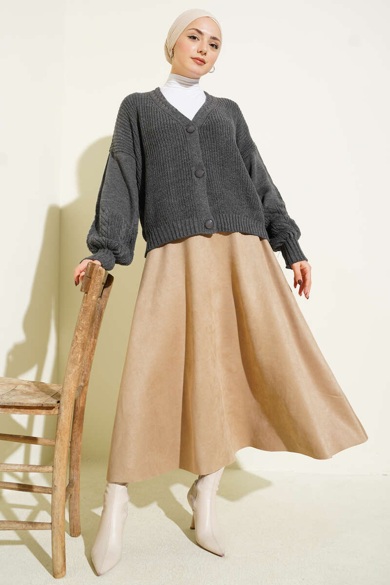 Gömlek Yaka Düğmeli Üç İplik Elbise Füme