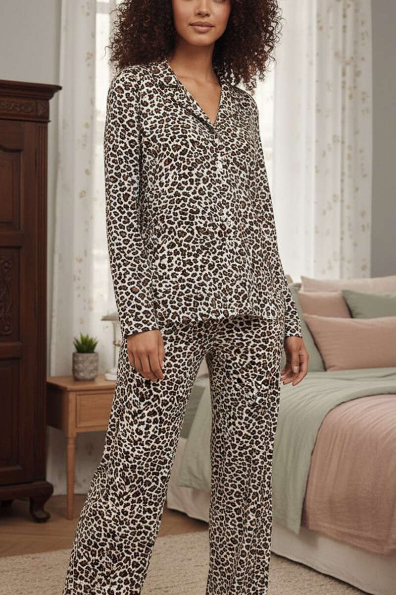Desenli Düğmeli Süet Pijama Takımı Bej