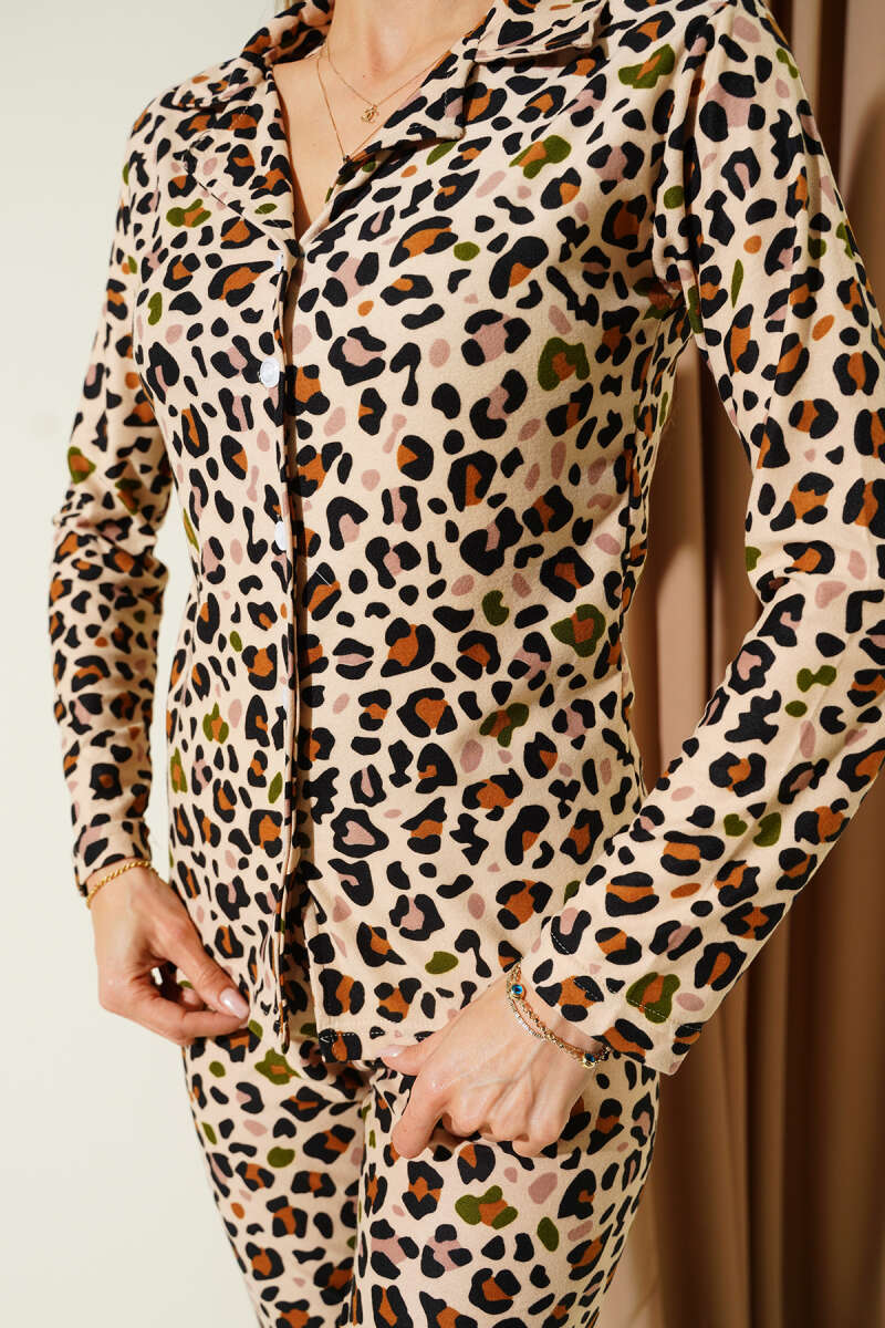 Desenli Düğmeli Süet Pijama Takımı Latte