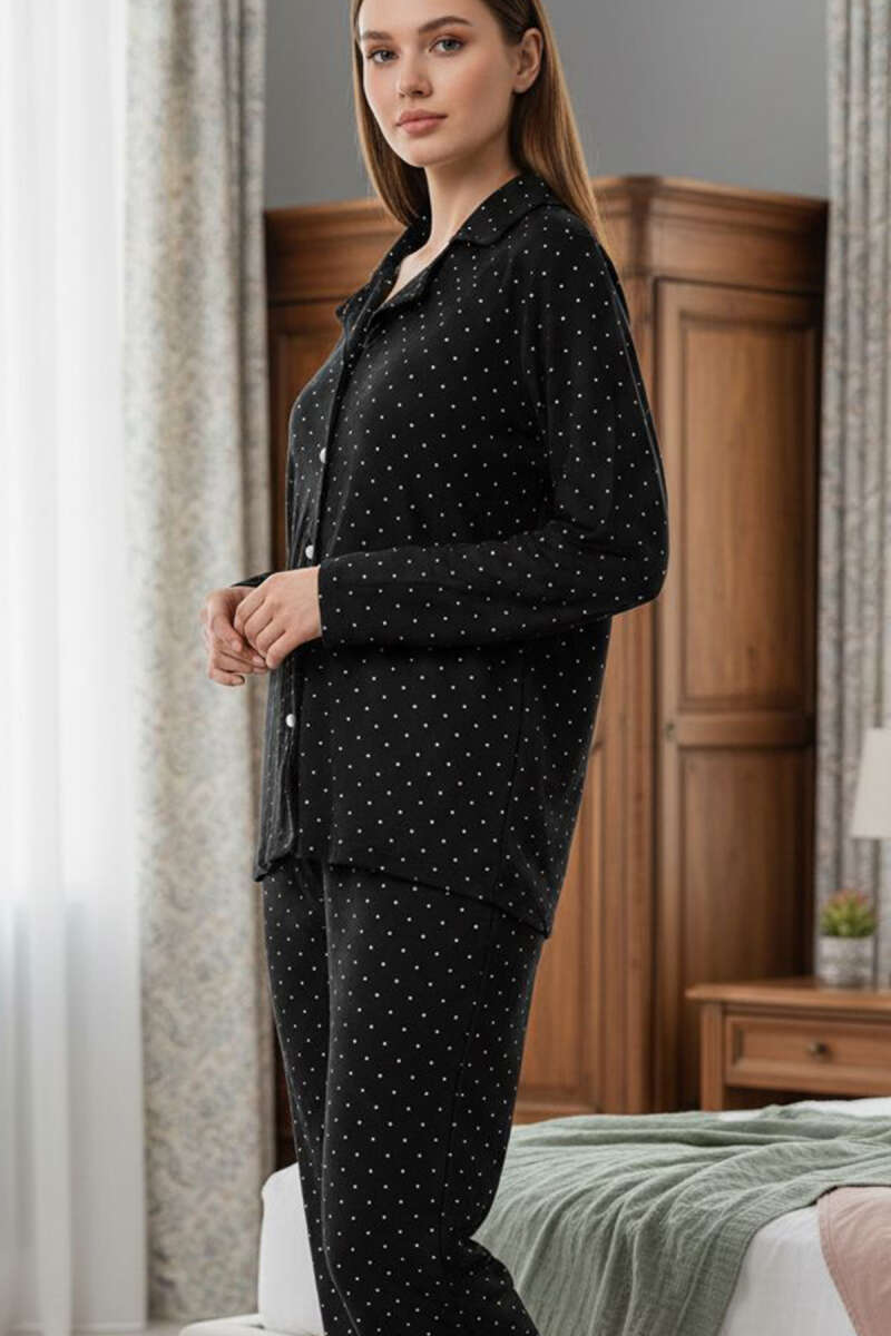 Desenli Düğmeli Süet Pijama Takımı Siyah Puantiye