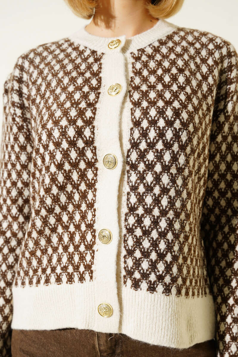 Gold Düğmeli Ters Dikişli Triko Hırka Ekru