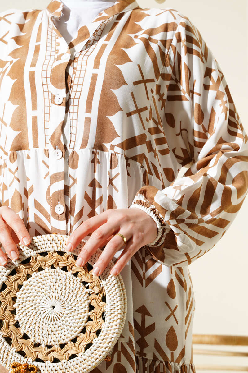 Desenli Hakim Yaka Düğmeli Elbise Lacivert