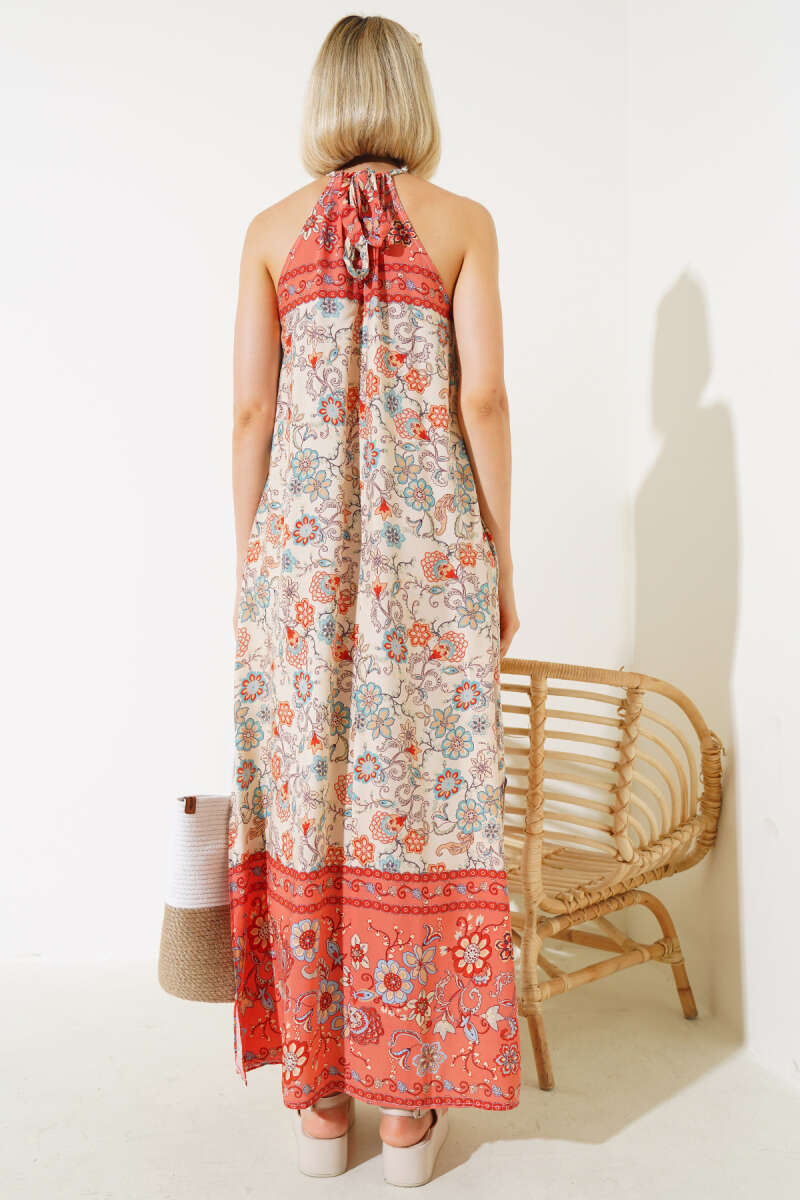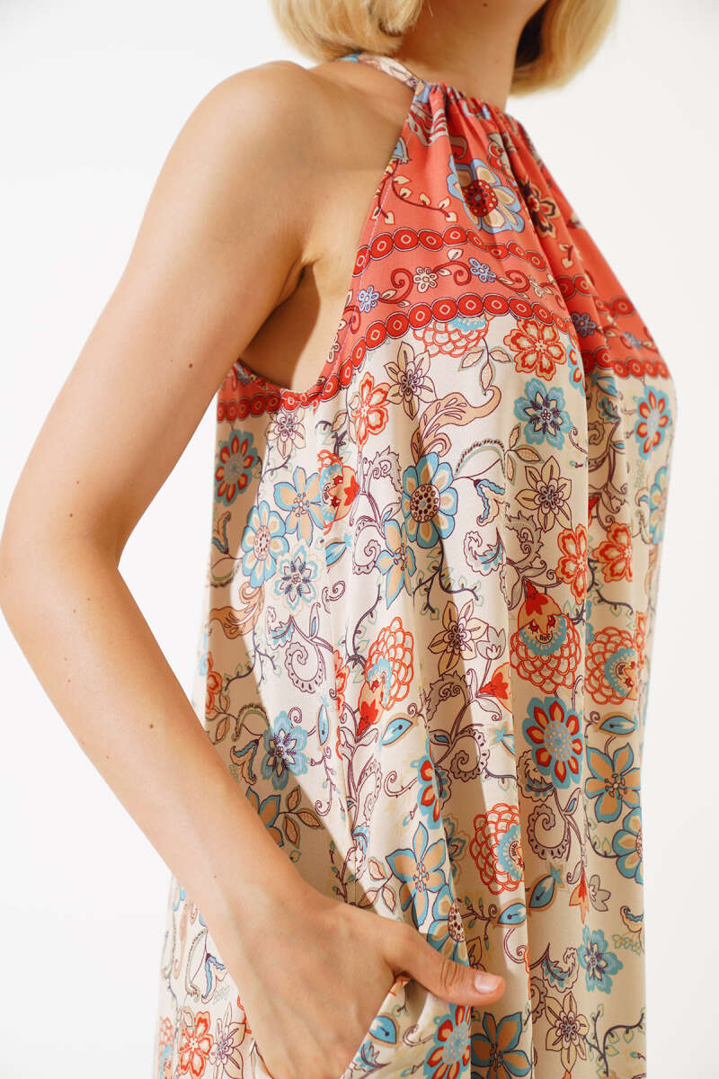 Desenli İp Askılı Yırtmaçlı Elbise Bej