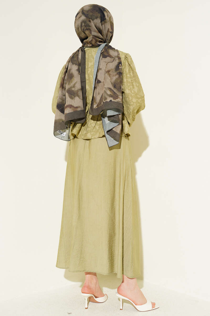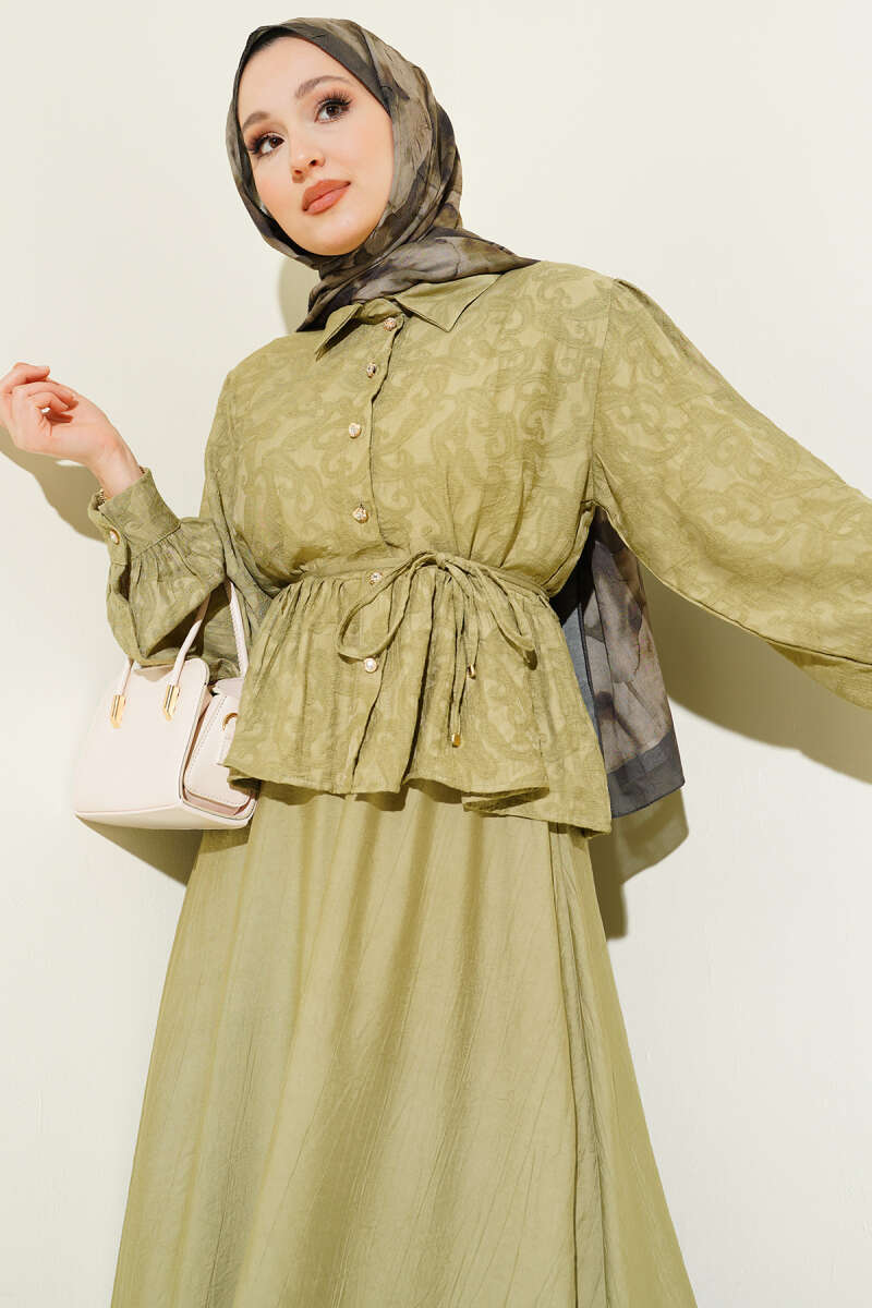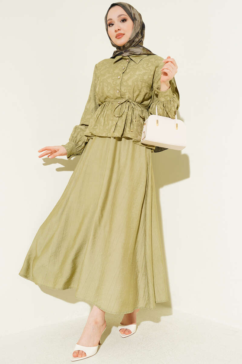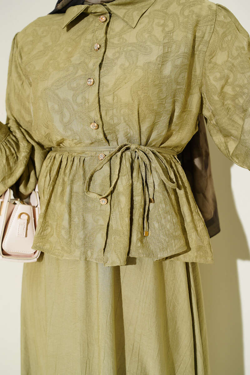 Desenli İp Kuşaklı Etekli İkili Takım Yağ Yeşili