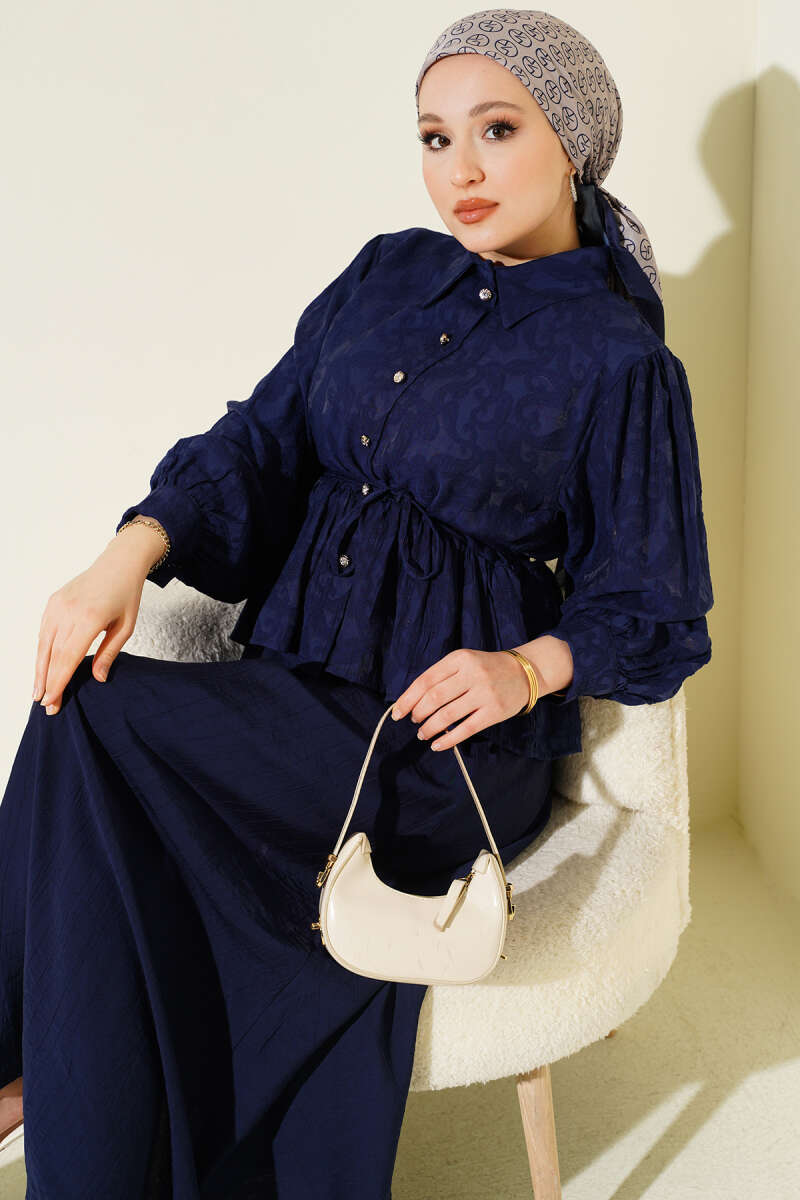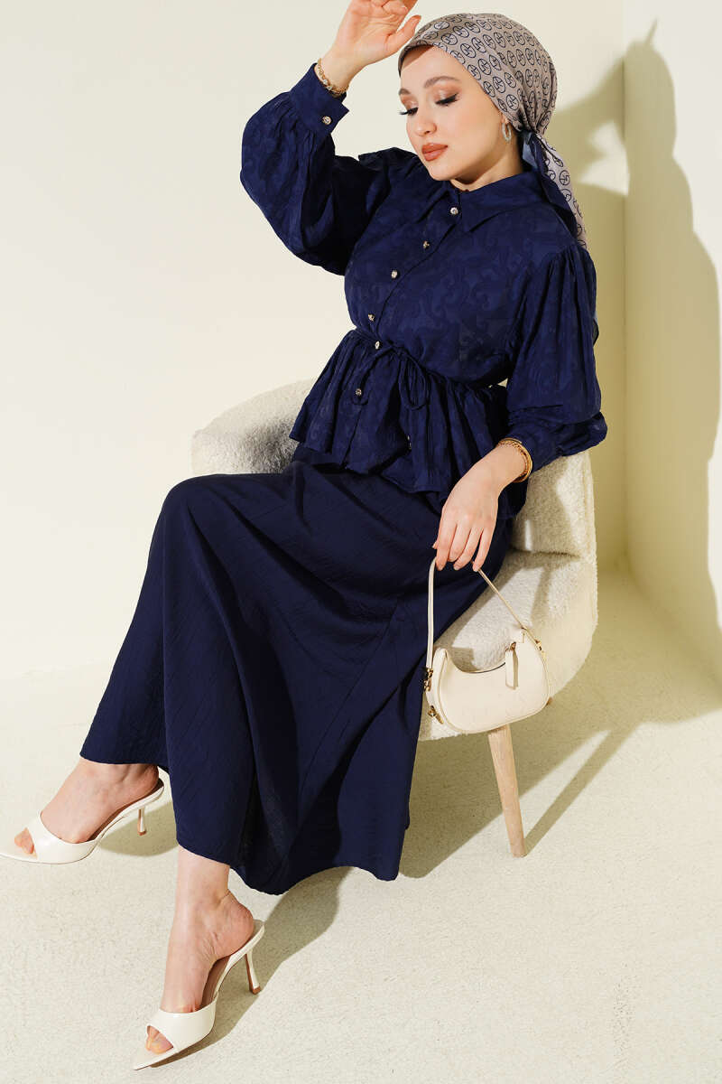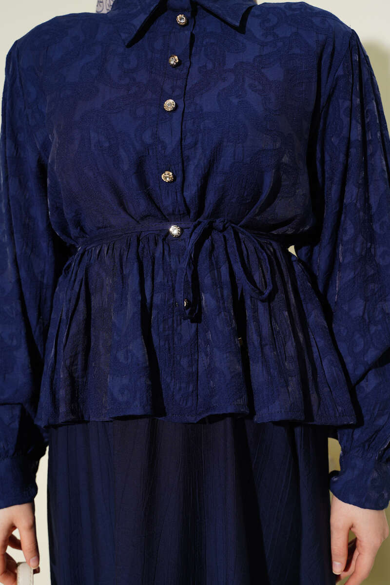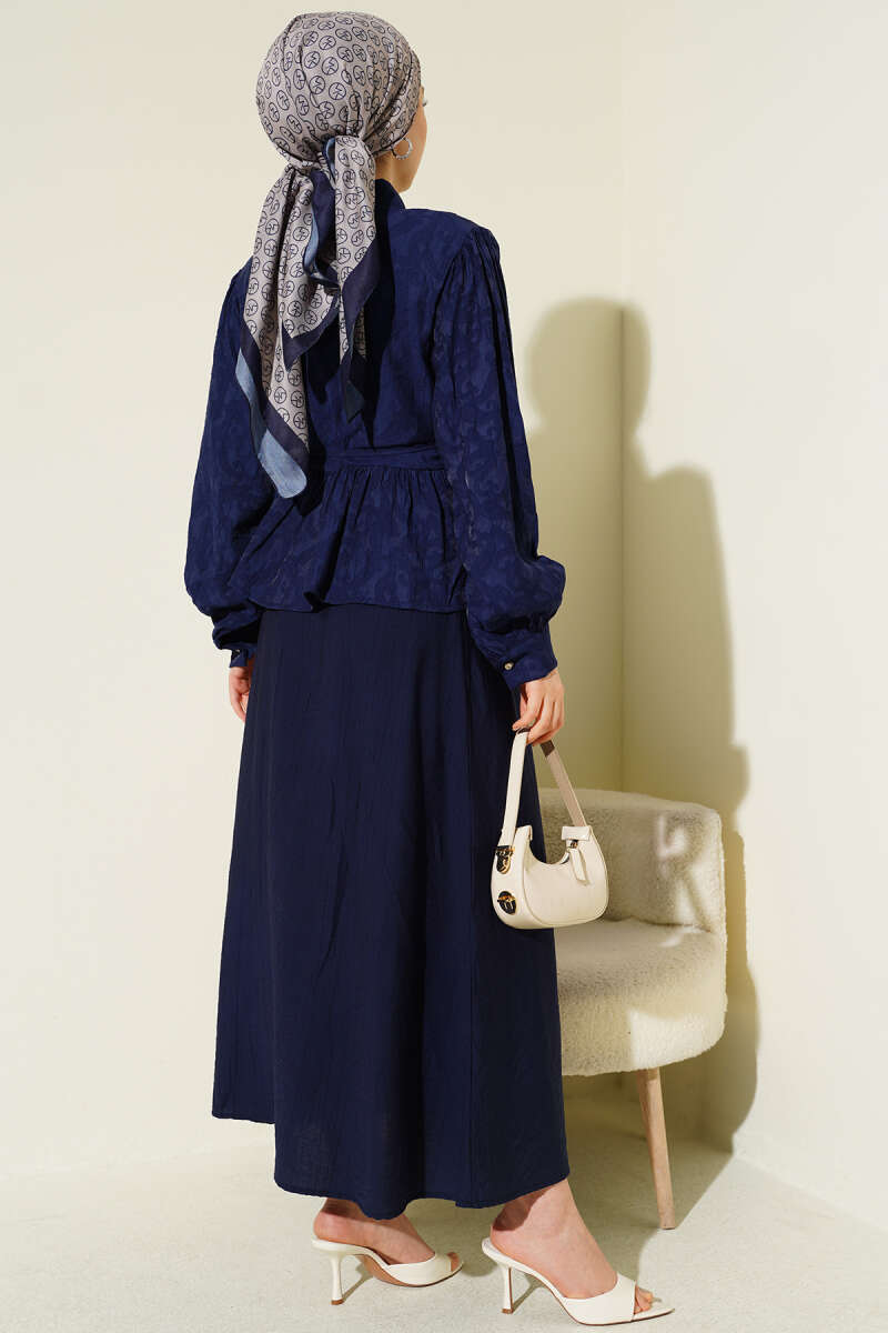 Desenli İp Kuşaklı Etekli İkili Takım Lacivert