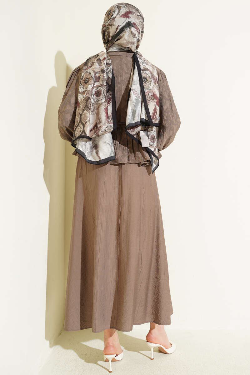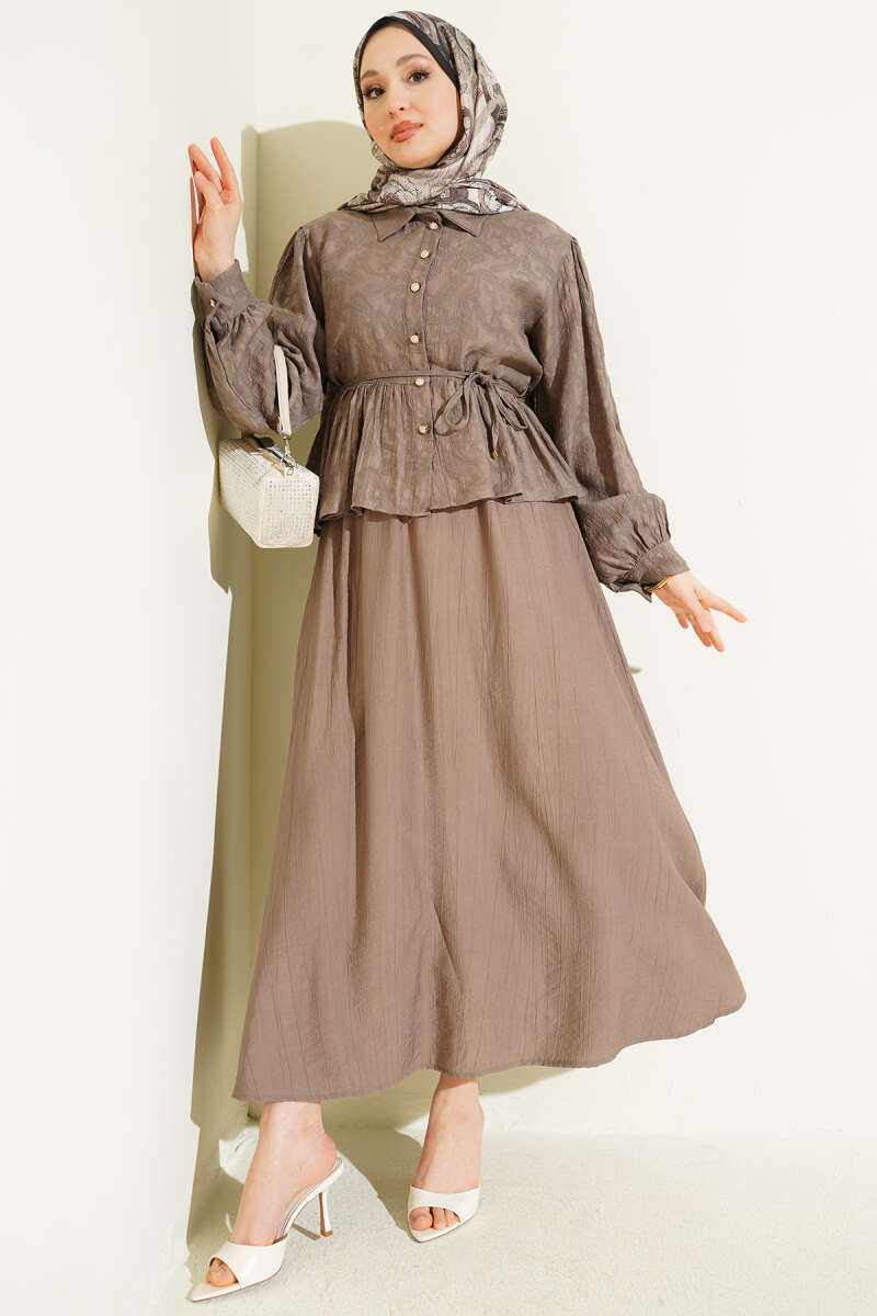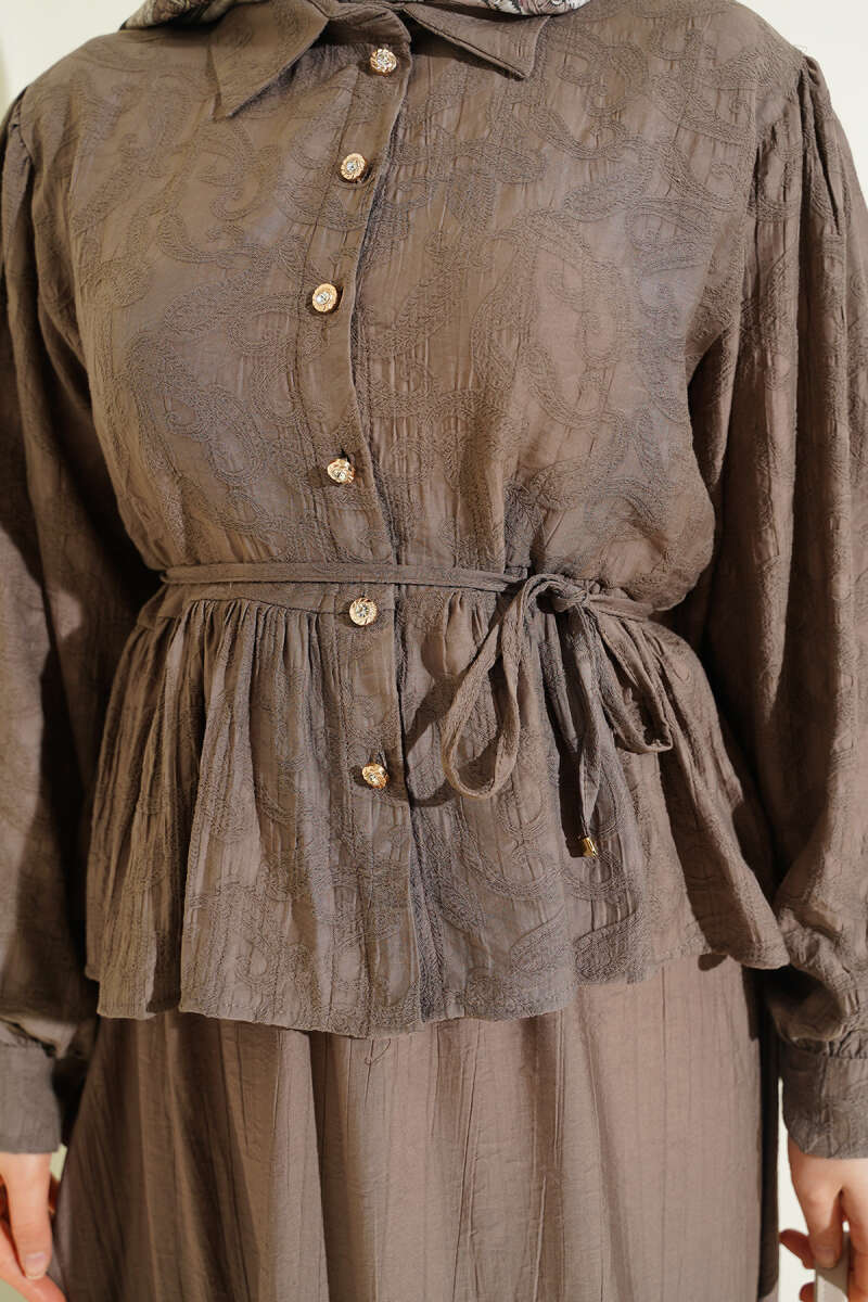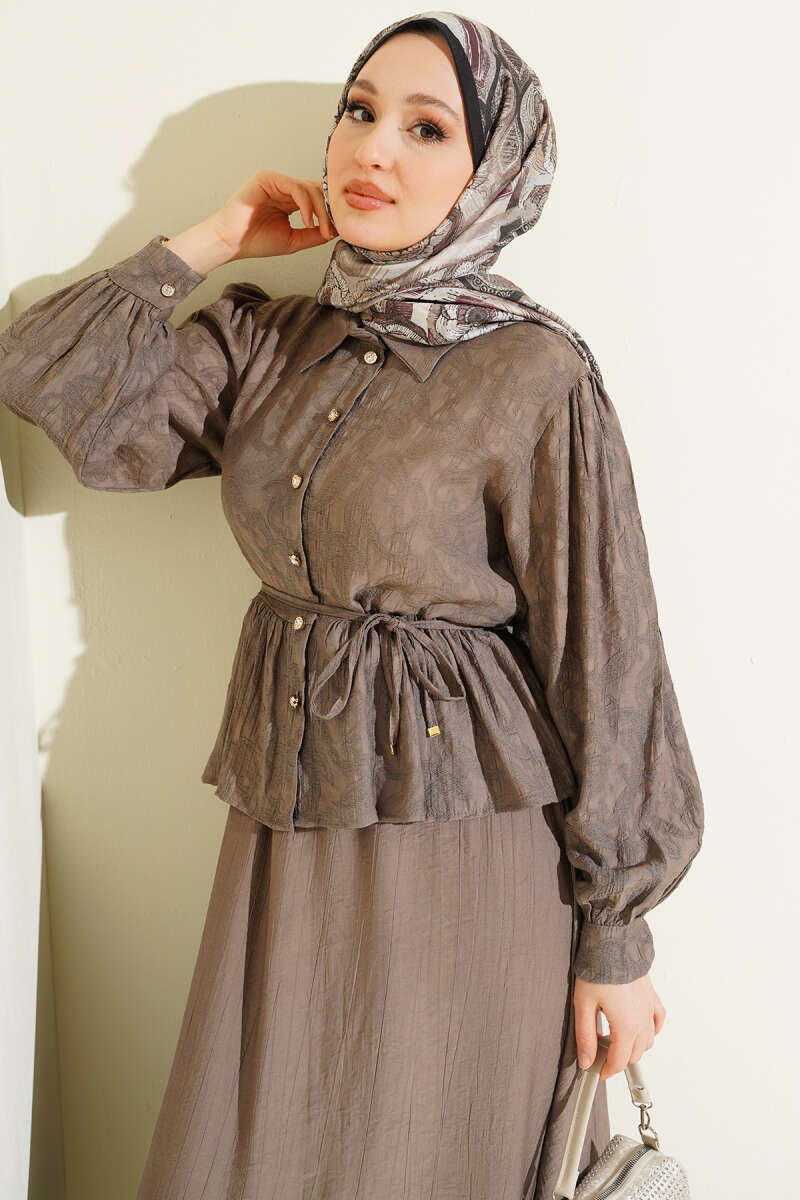 Desenli İp Kuşaklı Etekli İkili Takım Vizon