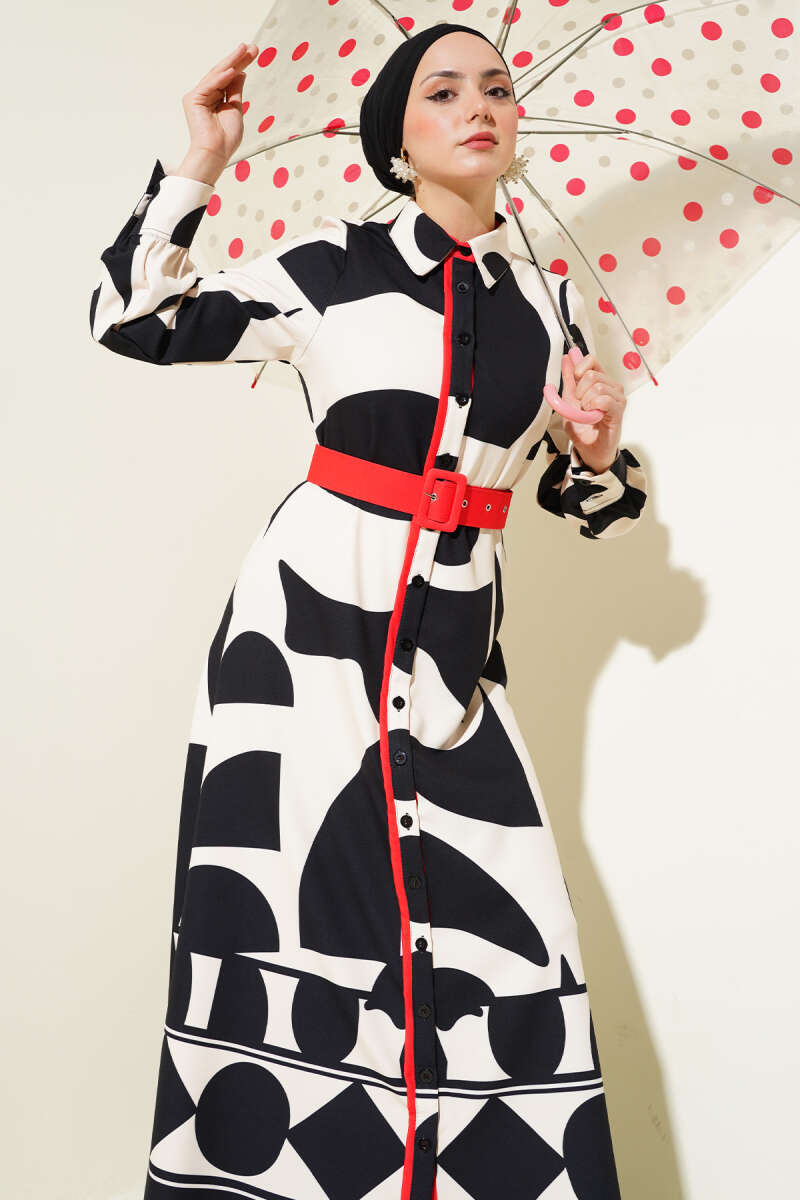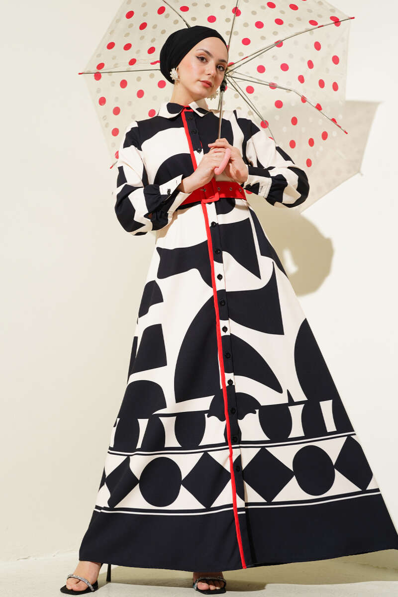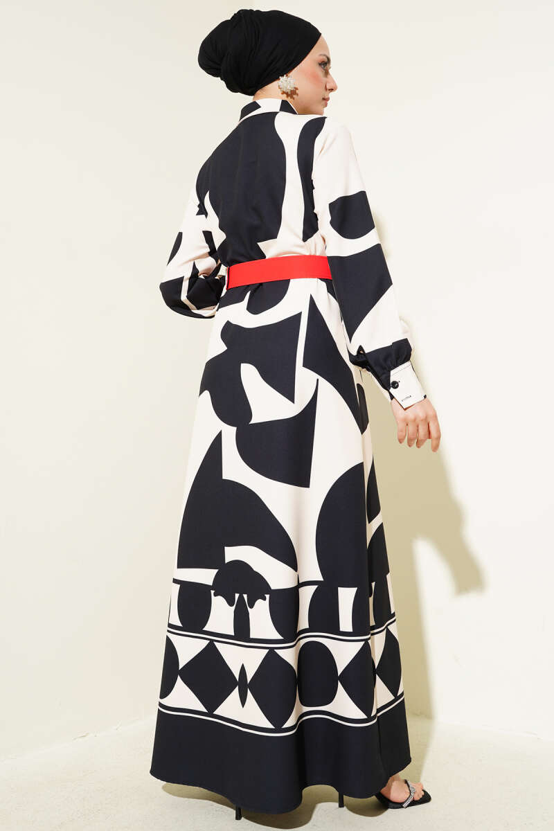 Metal Düğme Süslemeli Bağcıklı Elbise Siyah