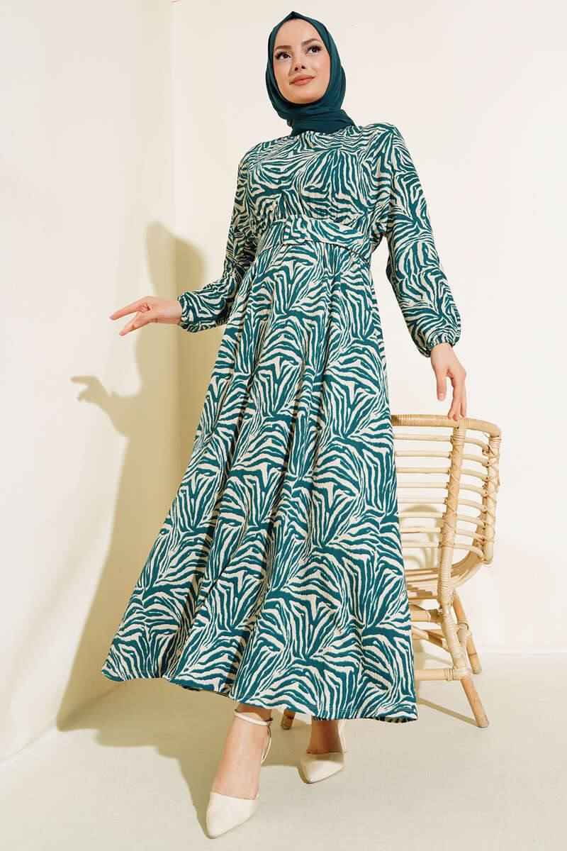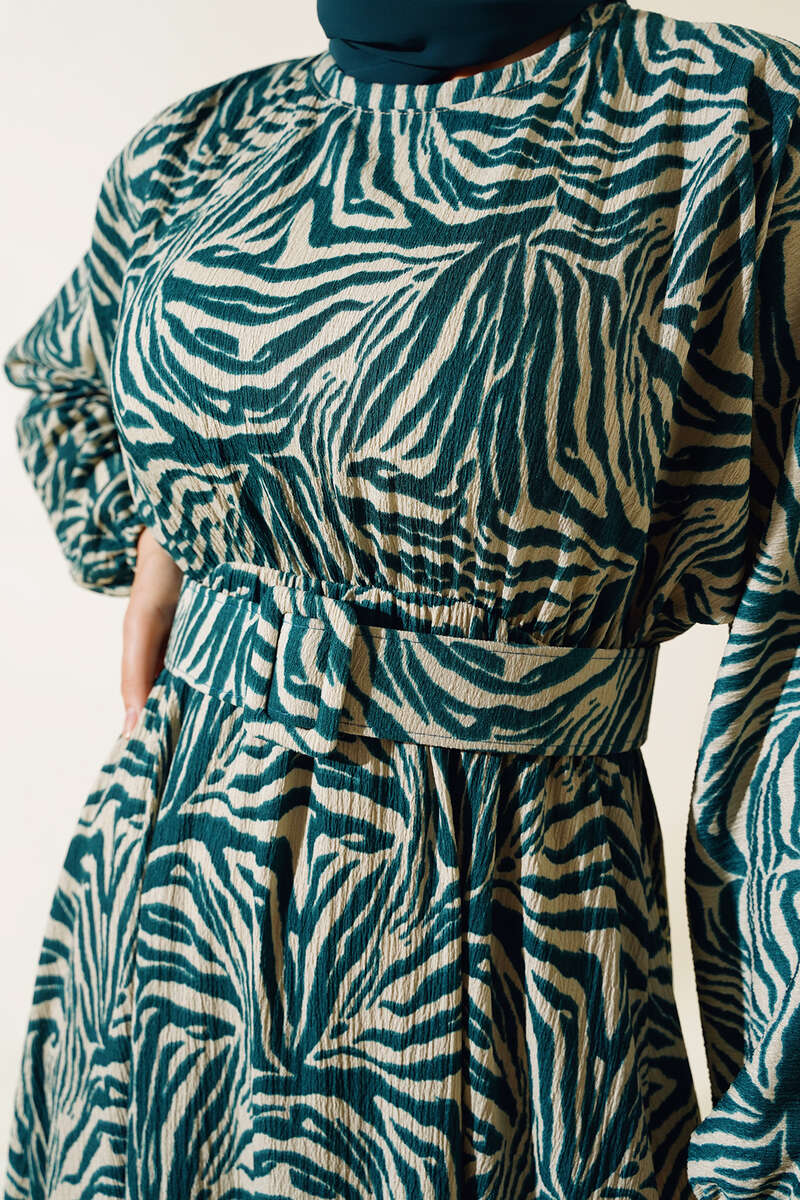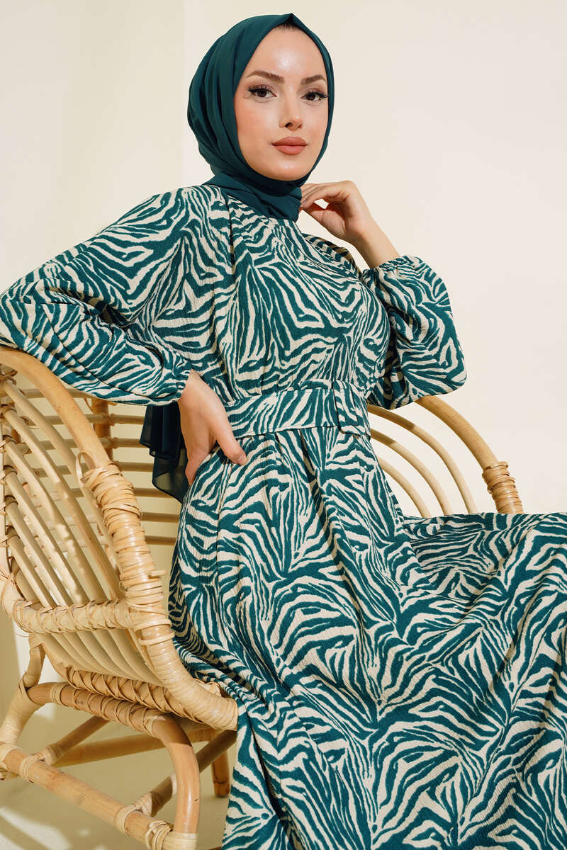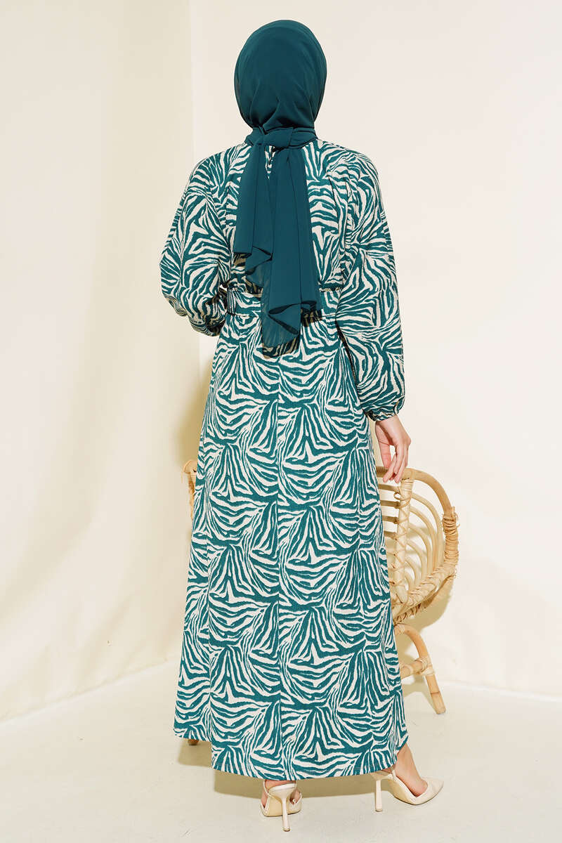Desenli Kemerli Bürümcük Elbise Zümrüt