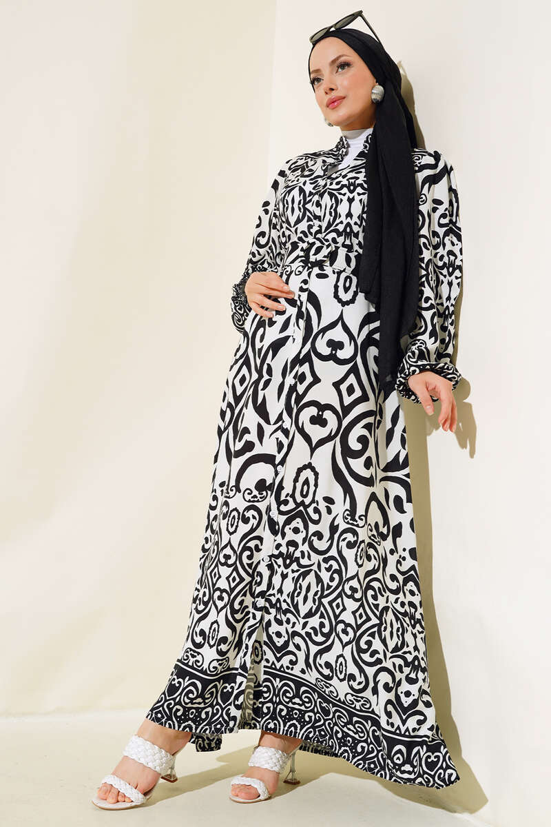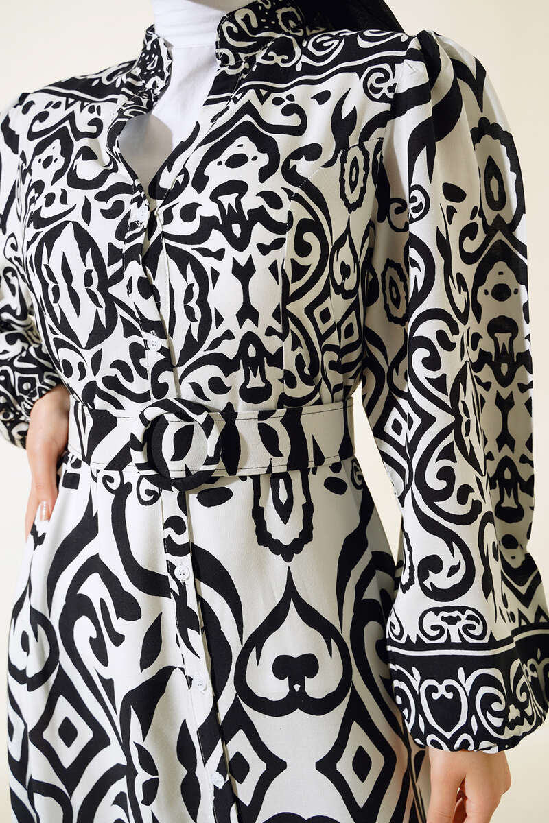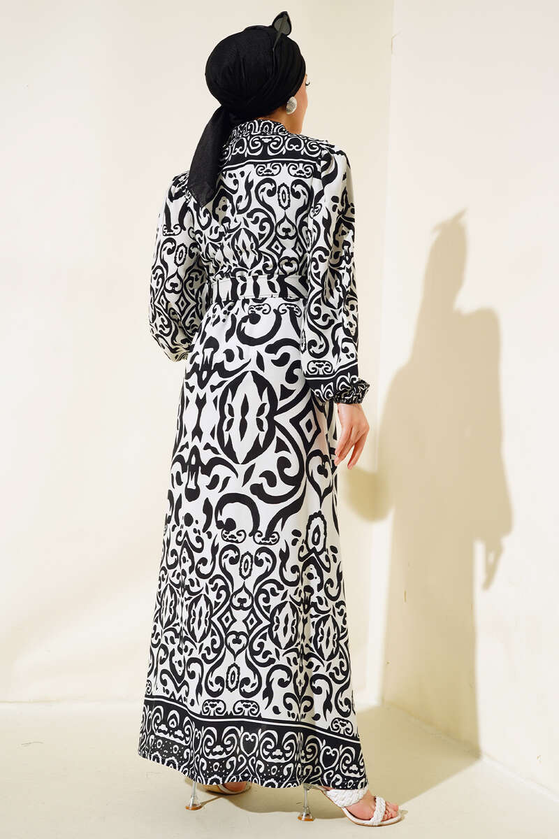 Desenli Kemerli Elbise Siyah