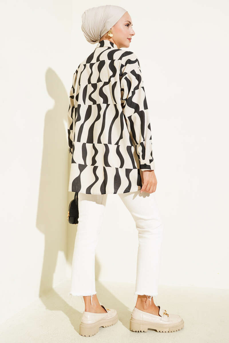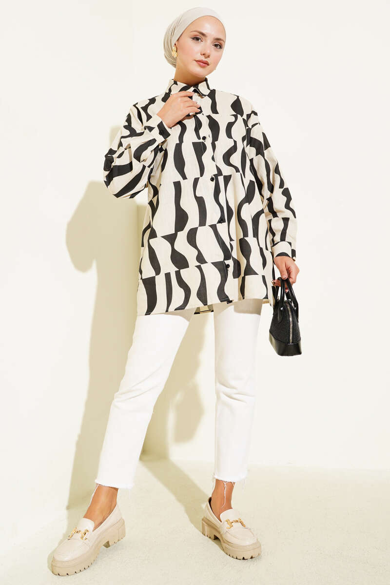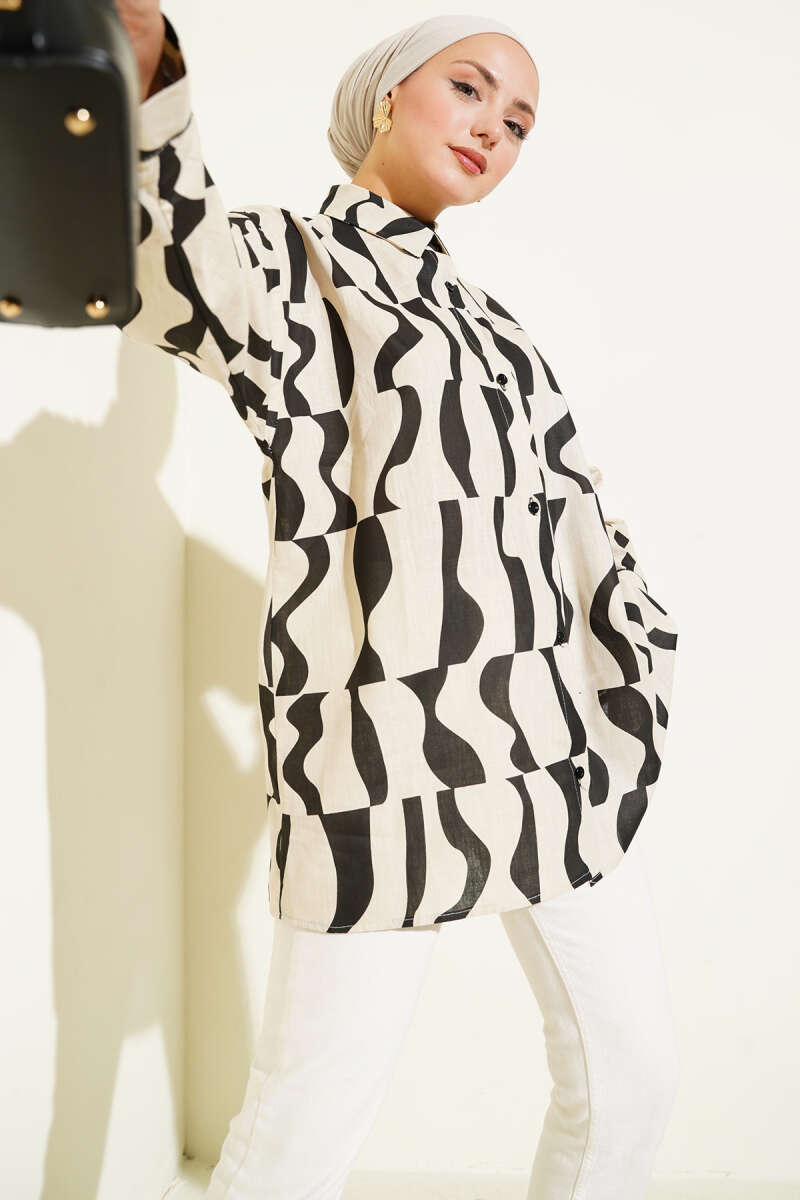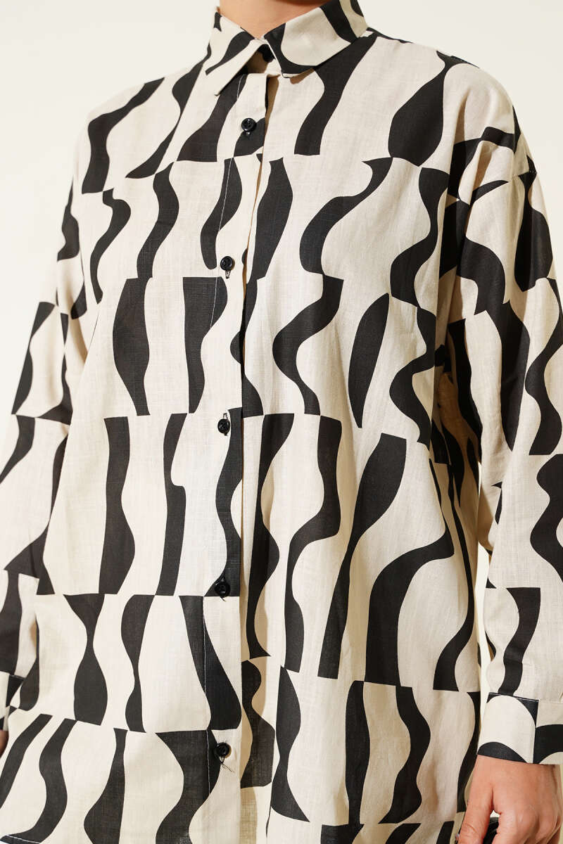 Tahta Düğmeli Ağaç Kabuğu Uzun Gömlek Bej