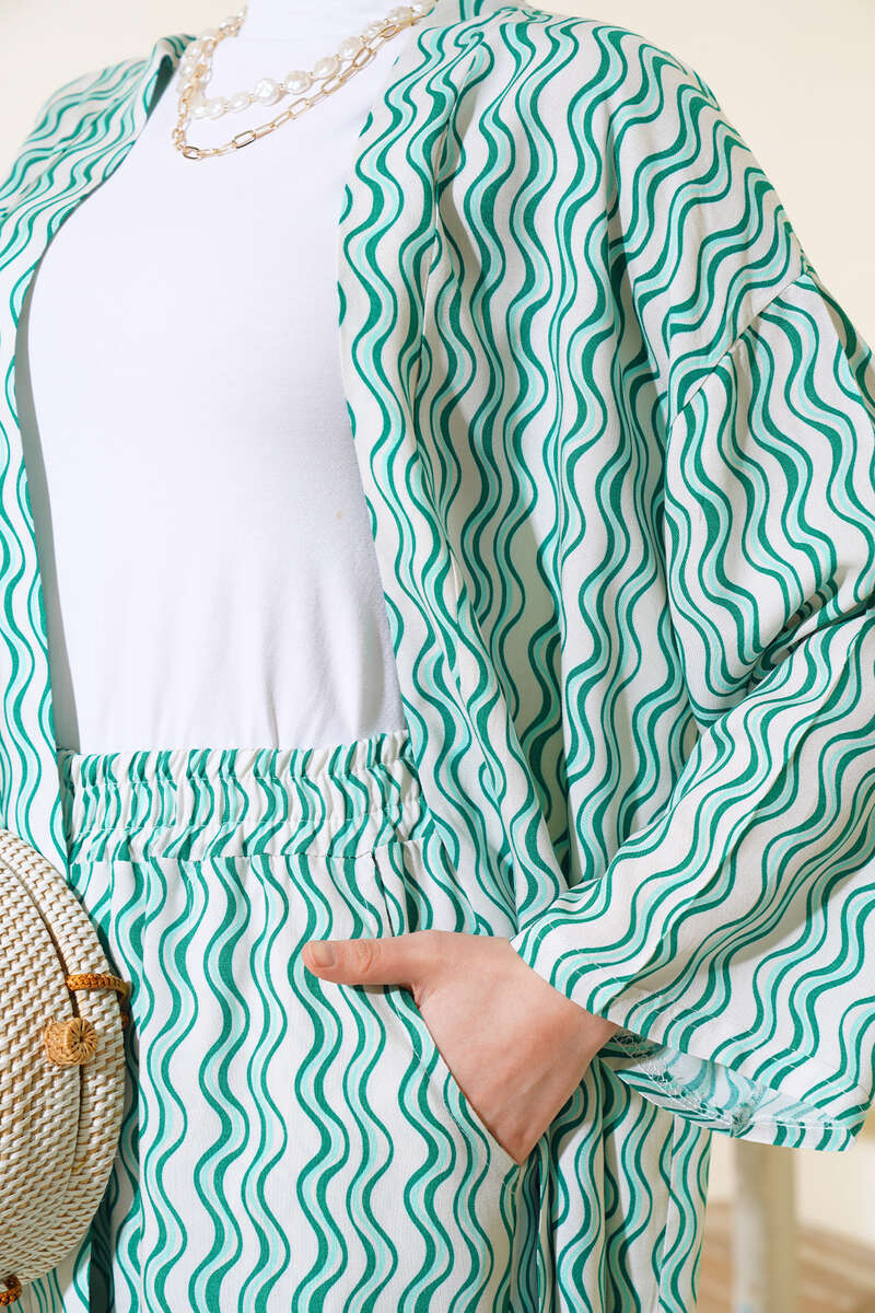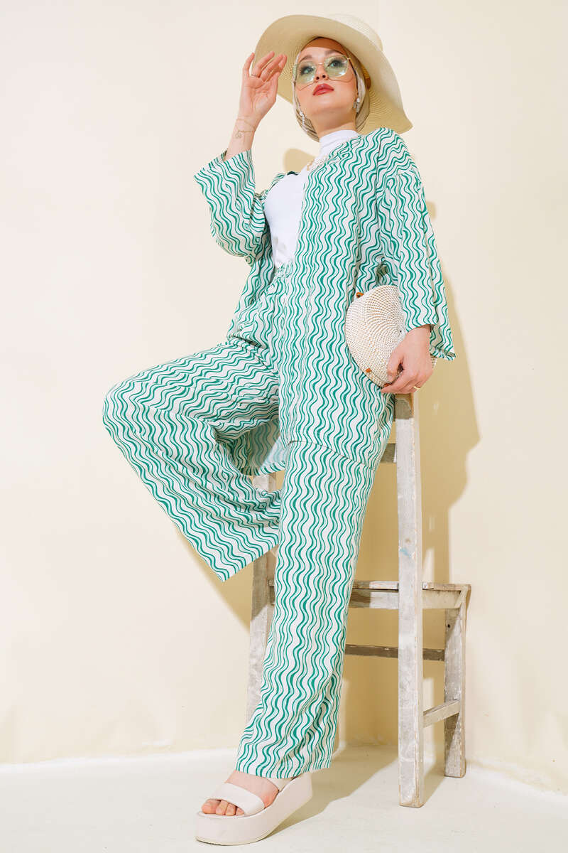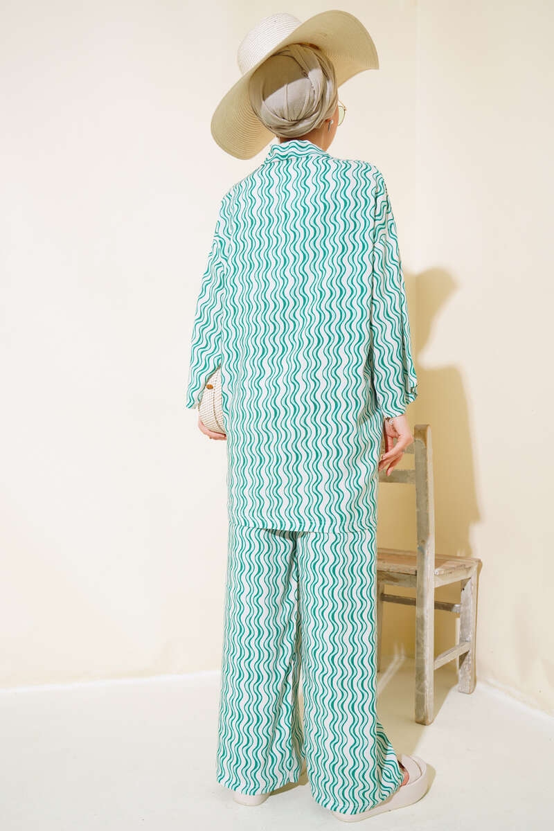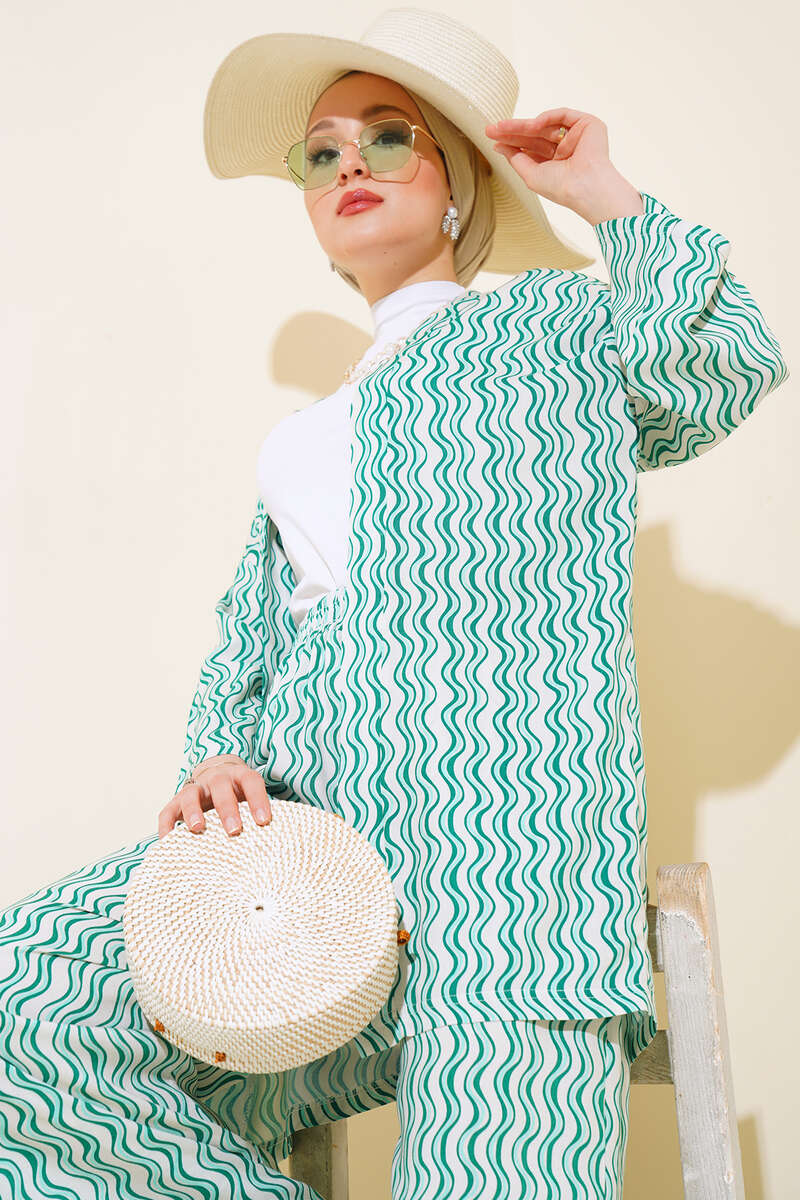 Yeni sezon ikili takım modelimiz sizlerle beraber. Desenli ikili takım modelimizin gömleği boydan düğmelidir. Salaş modeldir. Önü kısa arkası uzundur. Pantolonumuzun beli lastiklidir. İki adet yan cebi bulunmaktadır. Geniş paça modeldir. Desenli hareketli ikili takım modelimiz dolaplarınızda yerlerini beklemektedir.