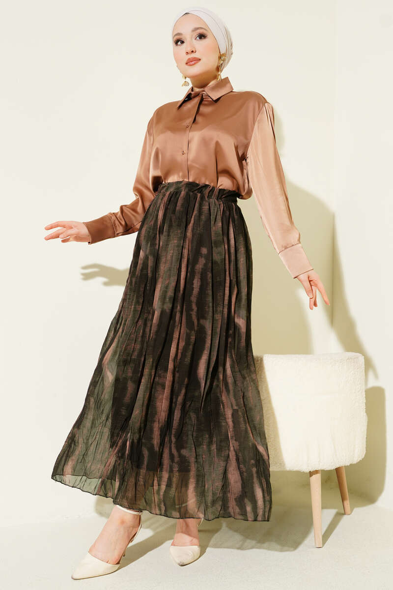 Beli Lastikli Kırışık Kloş Etek Kahve